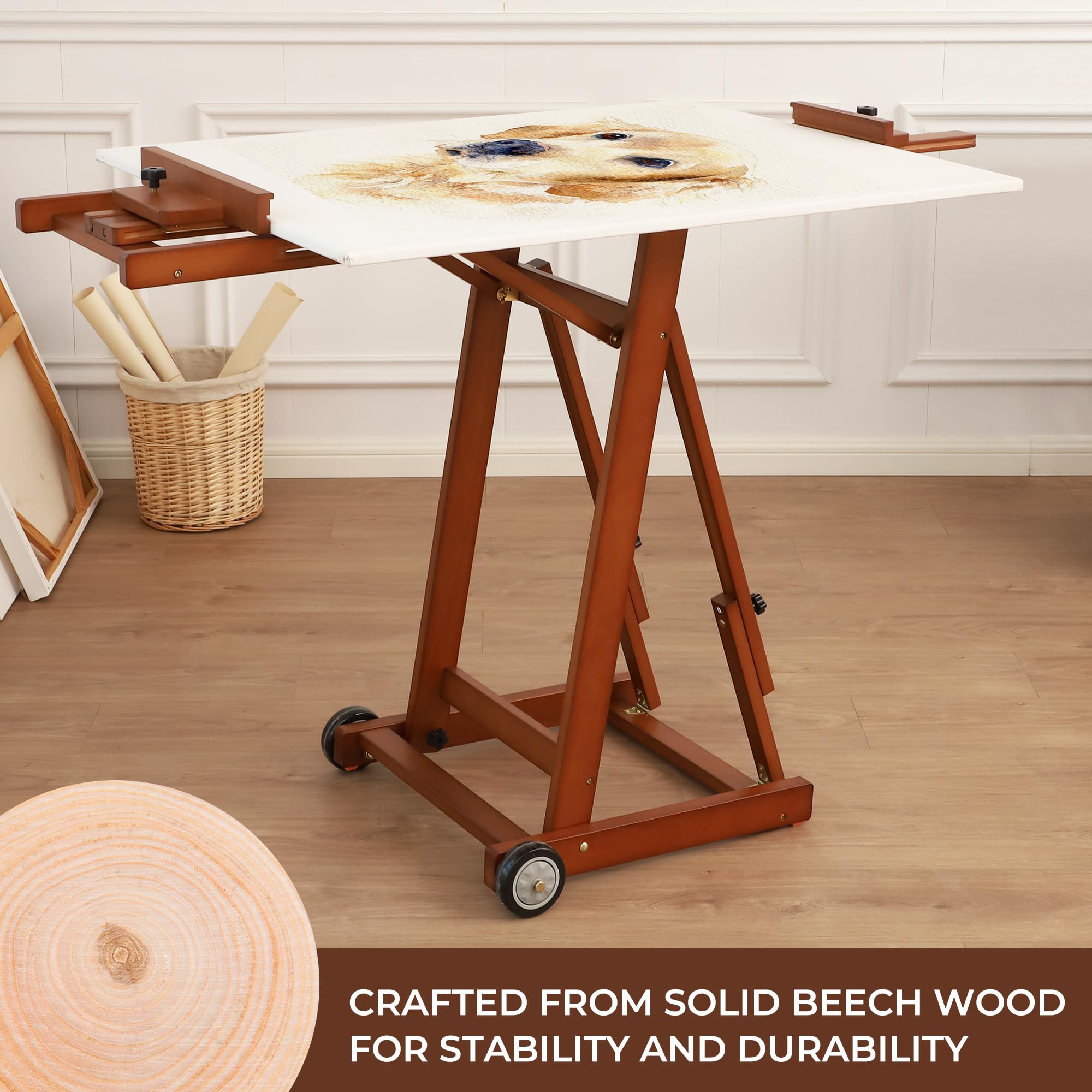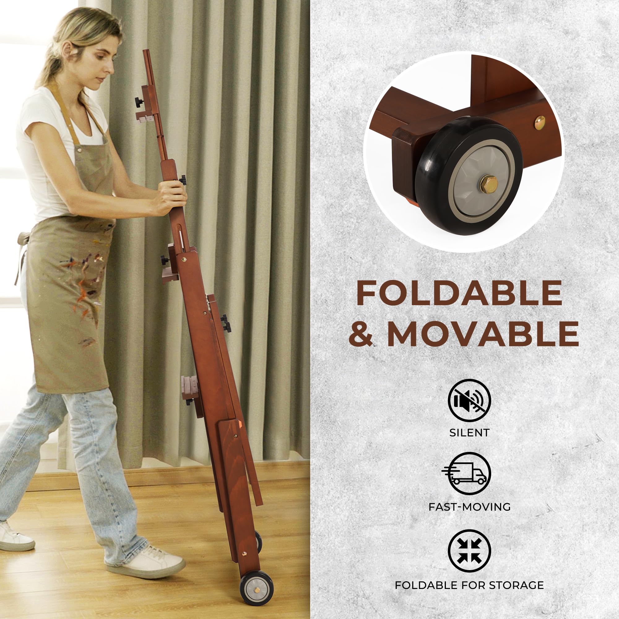 SMOOTH MOBILITY WITH STABLE BASE: Equipped with two front wheels for effortless movement while keeping the easel steady during use. This professional art easel is Ideal for adults, artists, students, studios, classrooms, or home use—wherever creativity strikes.
