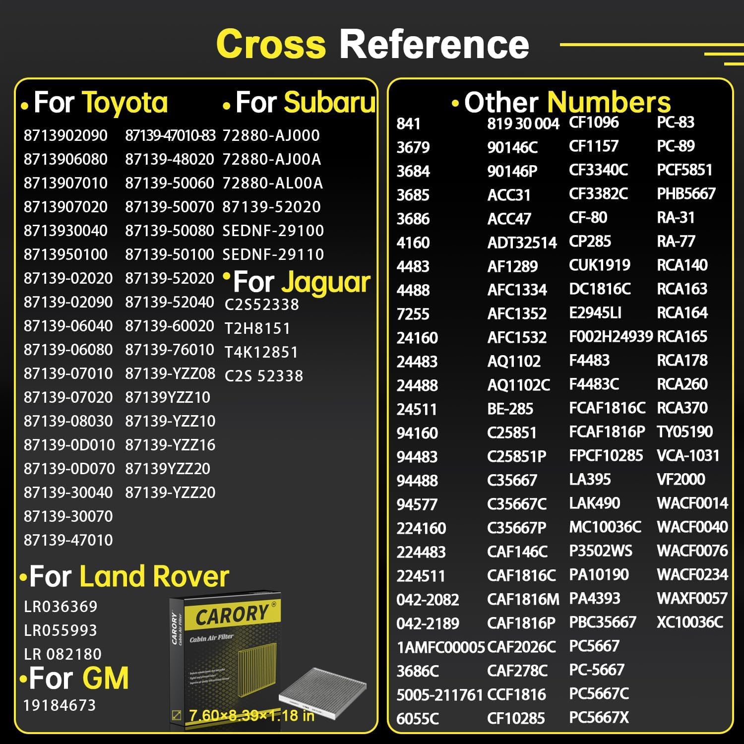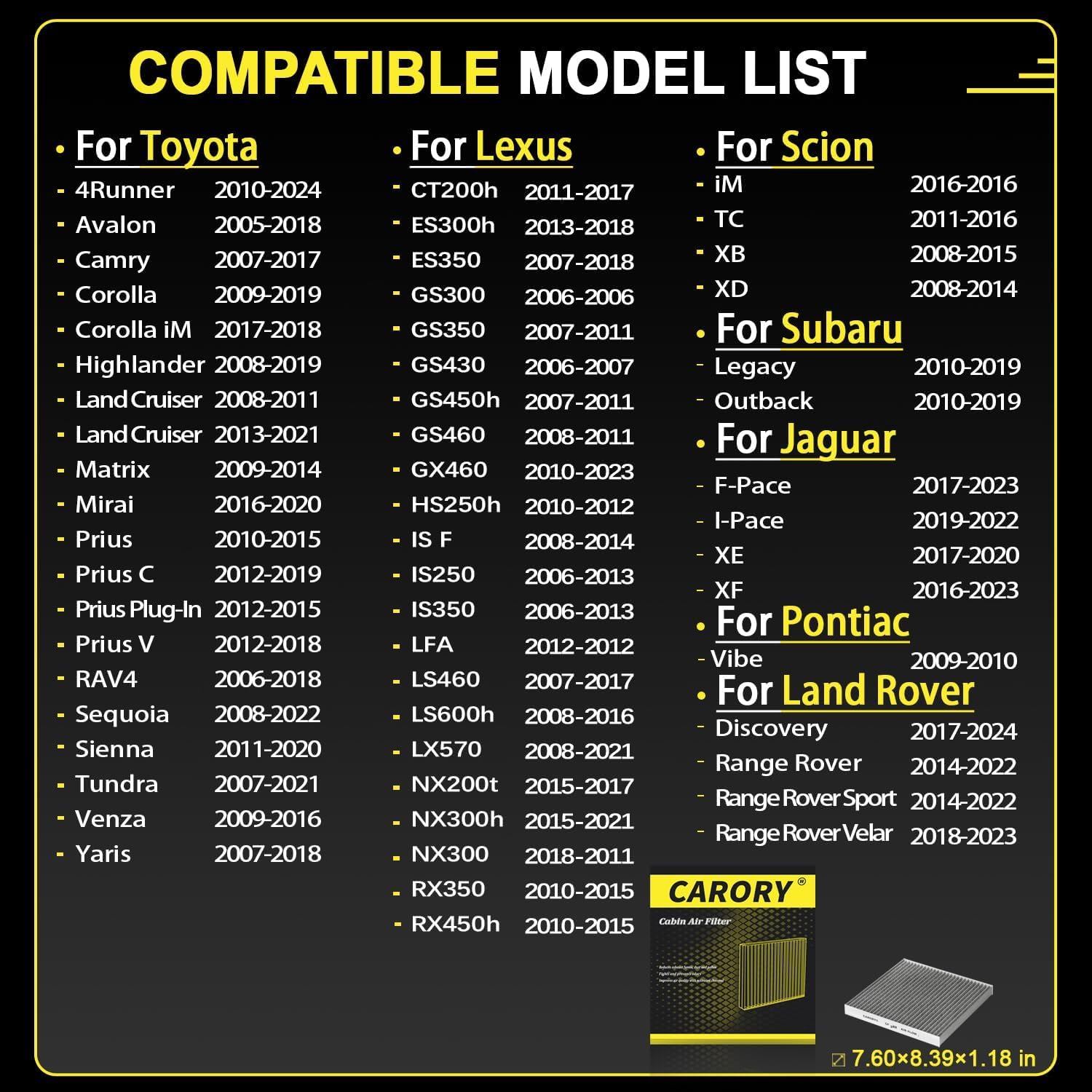 CARORY Cabin Air Filter w/Activated Carbon for Toyota Camry, Corolla, RAV4, Highlander, Lexus RX350, NX300, GX460, Subaru Legacy, Outback, Jaguar F-Pace, Land Rover Discovery, Range Rover and More
