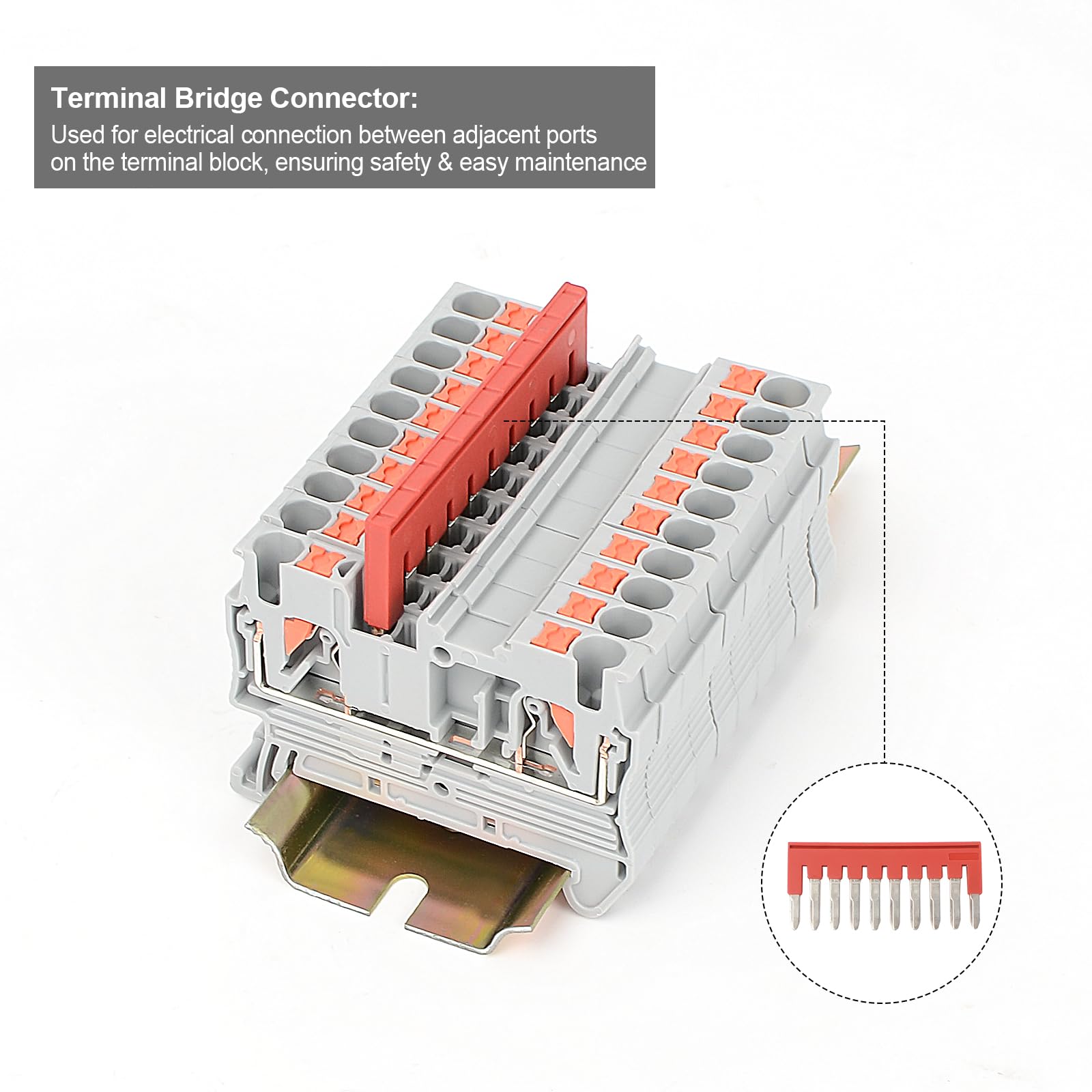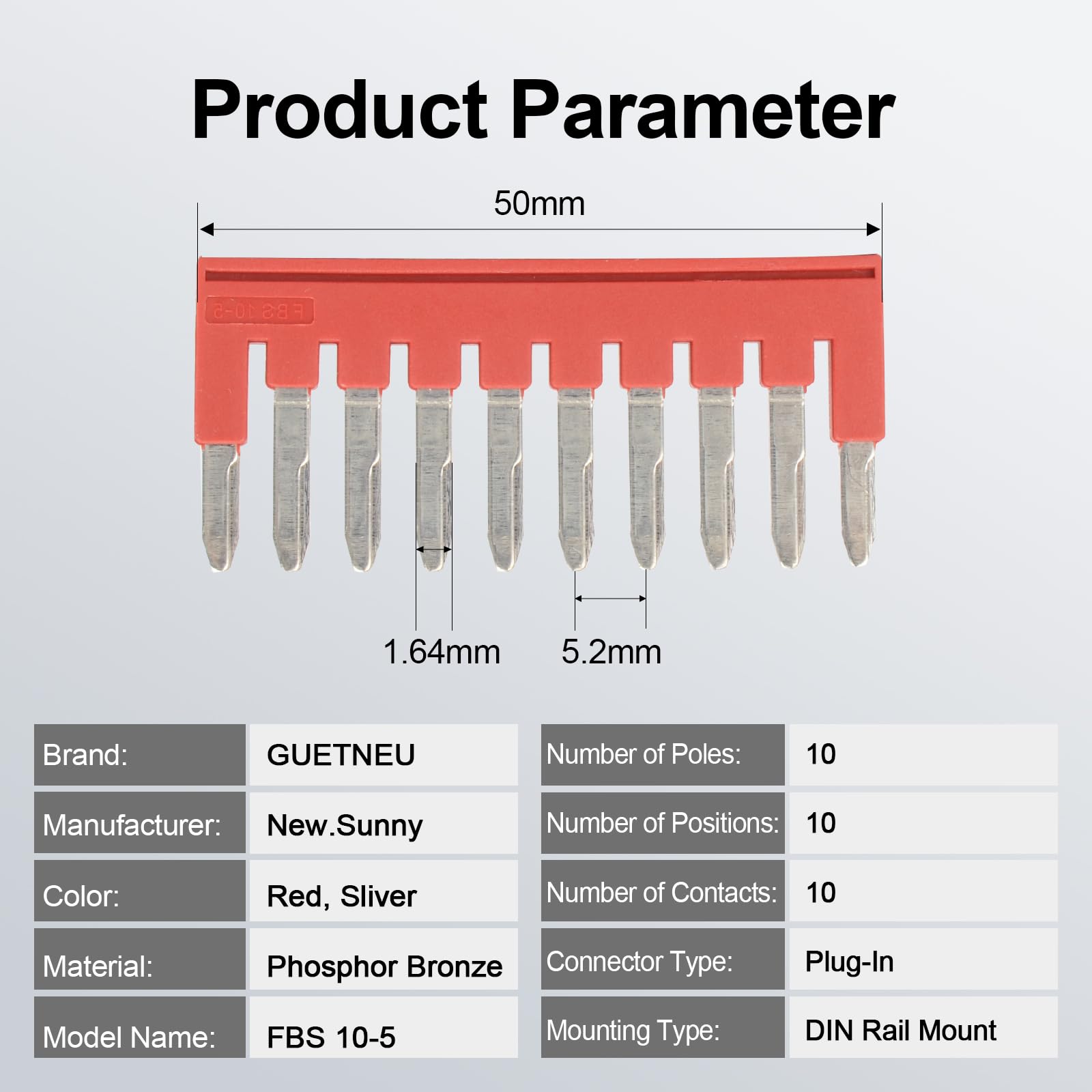 10Pcs FBS 10-5 Terminal Bridge Connector, DIN Rail Terminal Block Press, External Bridge for PT2.5 Jumpers The FBS 10-5 Terminal Bridge Connector is a high-quality solution designed to establish reliable electrical connections between adjacent wiring ports in terminal blocks. Made from premium phosphor bronze, this connector ensures excellent conductivity, corrosion resistance, and thermal conductivity, making it ideal for long-term use in a variety of electrical systems. The superior electrical conductivity ensures efficient and stable current transmission, while the excellent thermal conductivity aids in heat dissipation, ensuring your equipment runs smoothly and reliably. These terminal bridge connectors are compatible with PT2.5 external bridging jumpers, making them a versatile and reliable choice for industrial, commercial, and residential applications. The connectors can be used in electrical control systems, industrial automation, power distribution, traffic signaling, building wiring, and data communication systems. Their user-friendly design allows for easy installation, maintenance, and component replacement, providing a hassle-free solution for electrical setups. With brass conductive plates ensuring minimal contact resistance, these connectors offer optimal electrical performance. Their DIN rail mounting system ensures secure and stable installation, while the flexible and durable design guarantees they can withstand harsh environments. The FBS 10-5 is available in a 10-pole configuration, providing ample connections for various wiring needs. Whether you're working on a small project or a large-scale industrial system, the FBS 10-5 Terminal Bridge Connector delivers reliable, safe, and efficient electrical connections, making it the ideal choice for professionals and DIY enthusiasts alike. Ensure reliable and efficient electrical connections with the FBS 10-5 Terminal Bridge Connector.