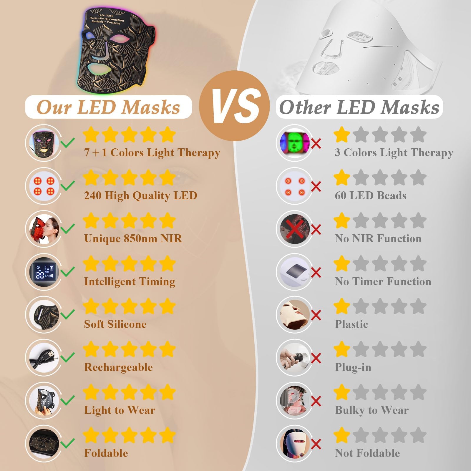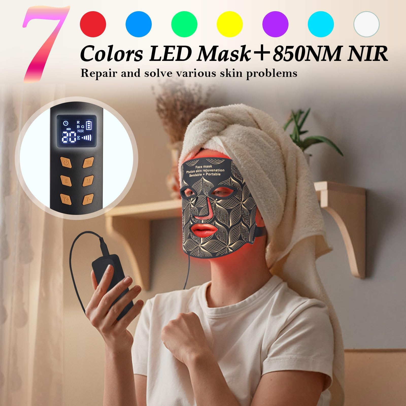 【7 +1 Colors Light Therapy Mask】The LED face mask light therapy possession 7 colors light with 850nm near-infrared, different wavelengths of light suitable for different types of skin, repair and solve various skin problems. Individually controlled 850nm near-infrared light and 7 colors light form multiple light waves that effectively penetrate deep into the skin cells, reshape skin vitality from the inside out, and improve skin condition
