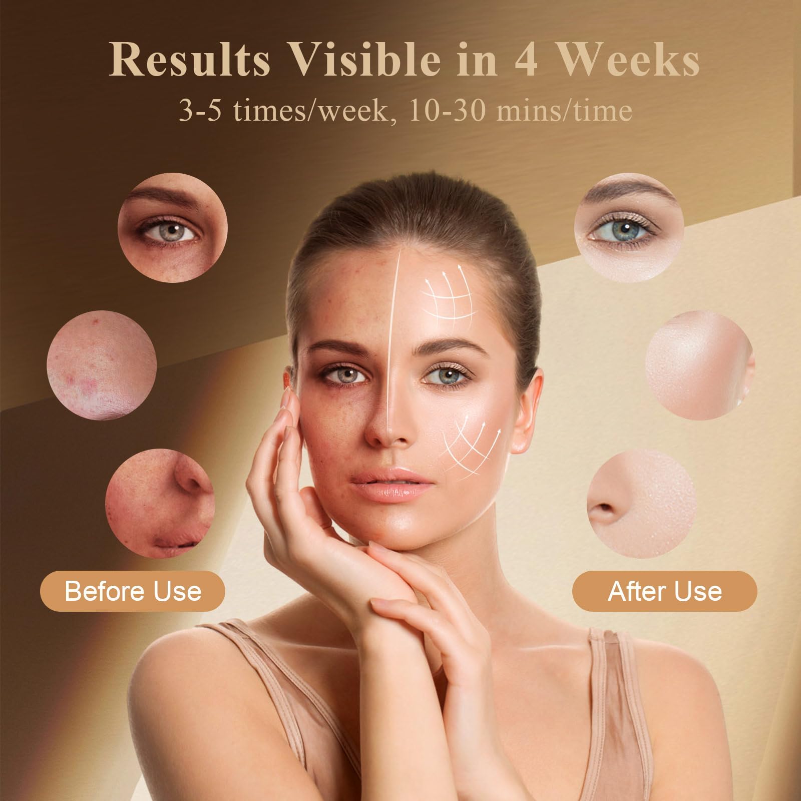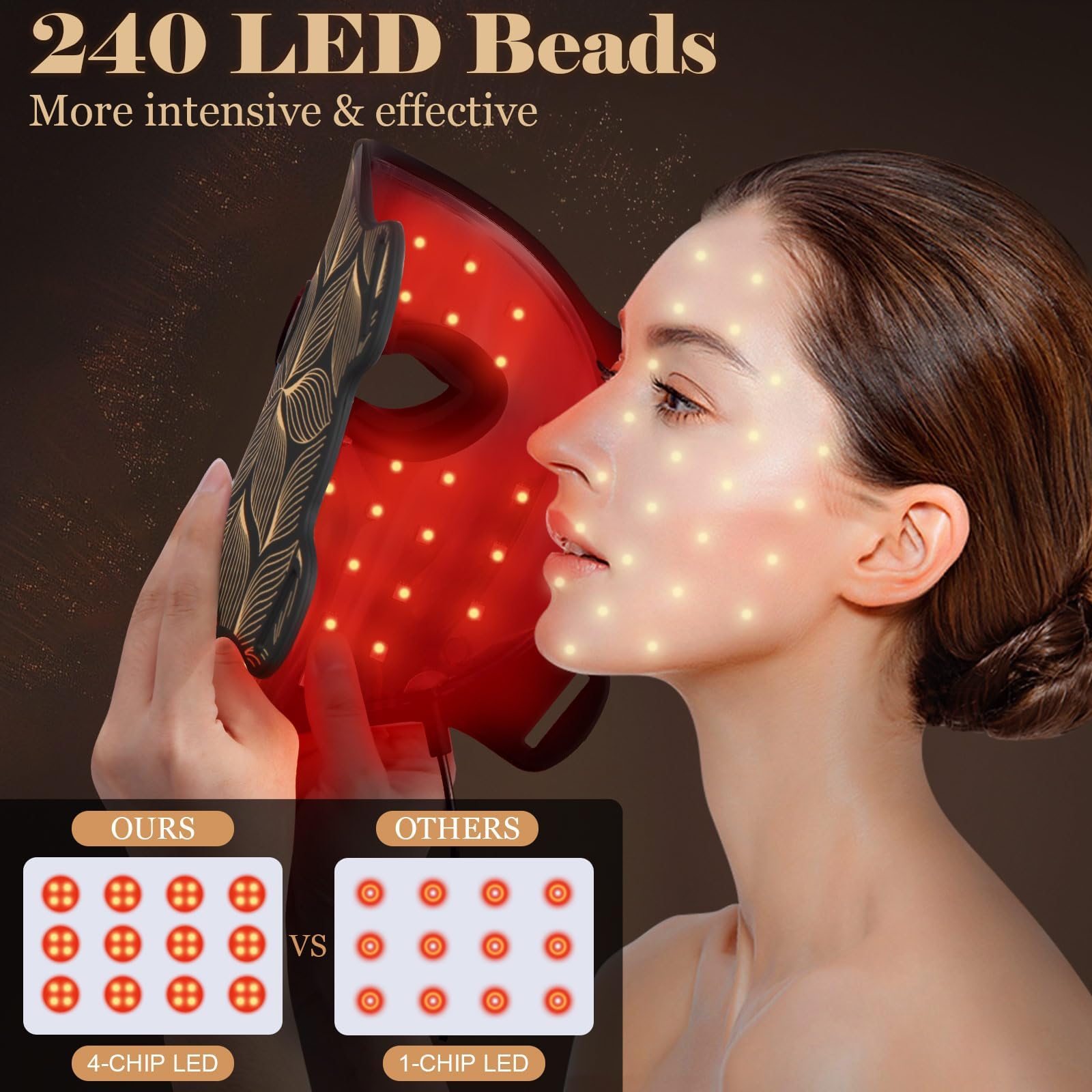 【240 LED Beads & Deep Repair】Red light therapy for face adopts innovative 4-in-1 chip technology, which increases the light wave aggregation effect by 4 times and the energy efficiency by 4 times, helping to improve the skin condition of the entire face. 3 levels of intensity adjustable, maximum 58mW/cm² high energy density into the skin cells layer by layer, promotes collagen regeneration, repairs skin, improves wrinkles, reduces acne, and brightens skin tone. The effect is visible within 4 weeks