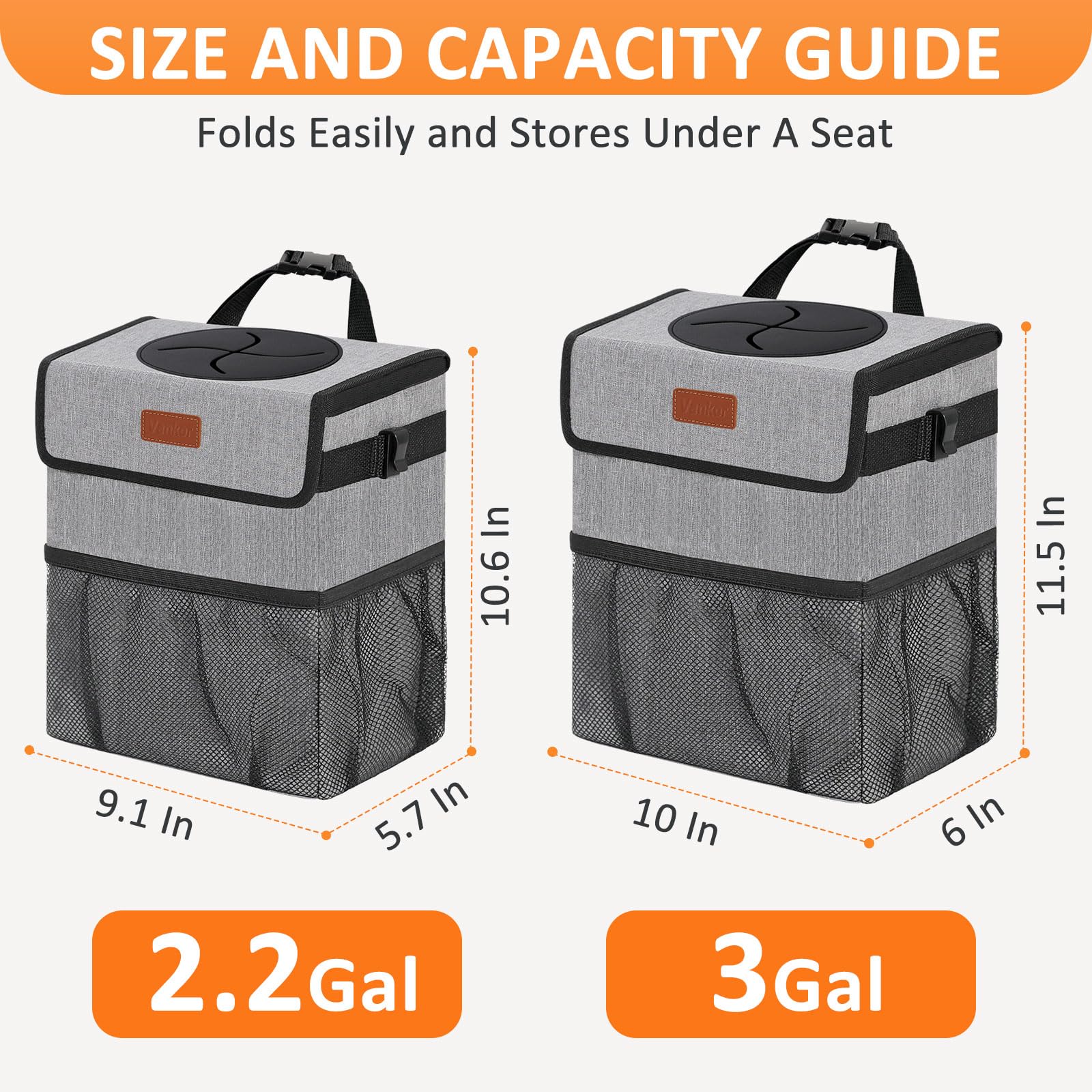 Intimate Design& Capacity: There are 2 side clasps for fixing disposable bags, effectively preventing falling out; Vankor car trash bags have about 2.2 and 3.0 Gallons for storage of car garbage or other stuff; Car trash bin has 100% leak-proof PEVA thick lining, no spillages will happen and is easy to be cleaned; The extra-large opening is made of elastic soft rubber, very roomy and easier to put litter into the bag, and helps to keep trash from spilling