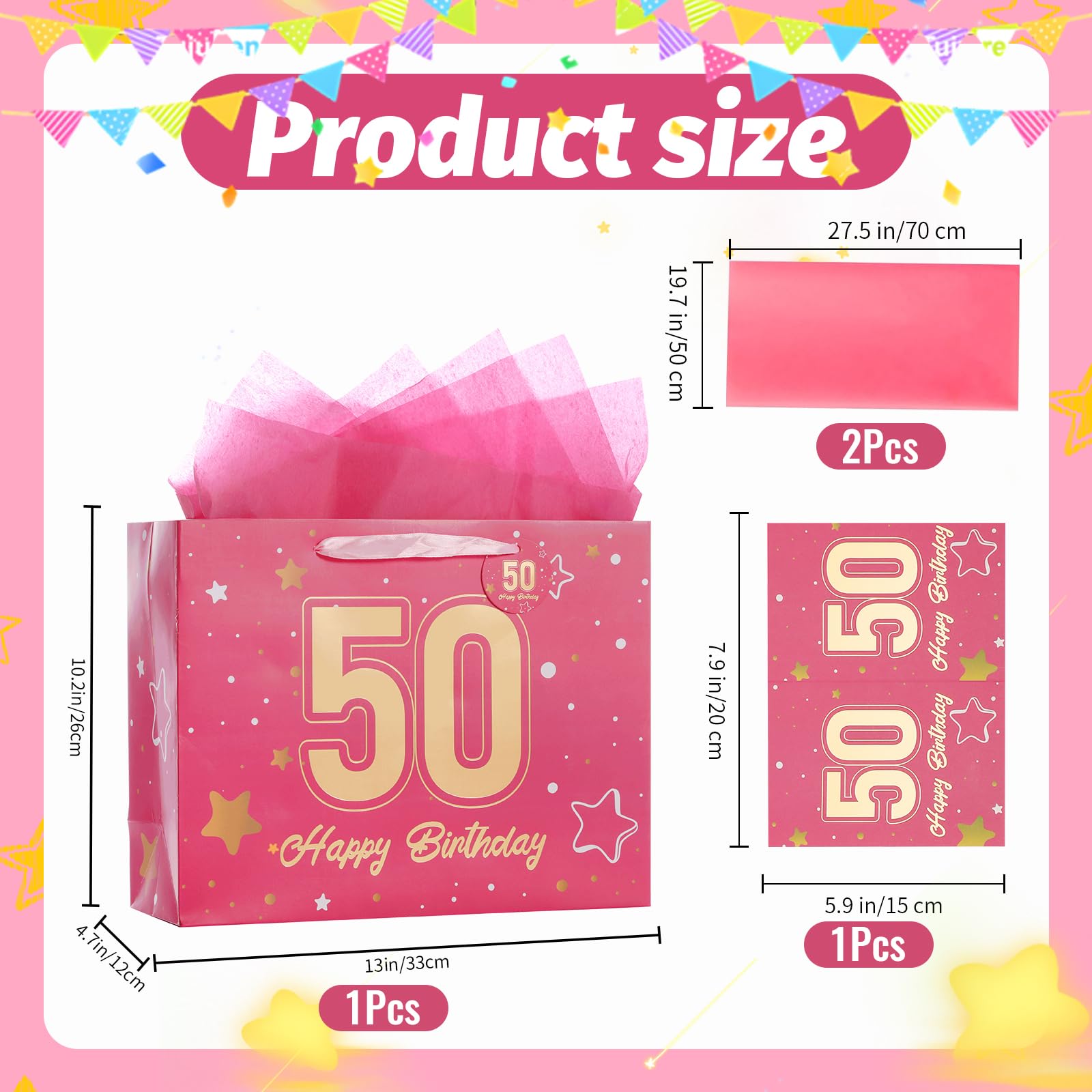 【50th Birthday Gift Bag】This 50th birthday gift bag set includes matching tissue paper, a greeting card, and tags. The decorative ribbon handles add a festive touch. It simplifies gift wrapping for a hassle-free experience. The gift bag measures 13" W x 10.2" H x 4.7" L; the card measures 7.9" W x 5.9" H.