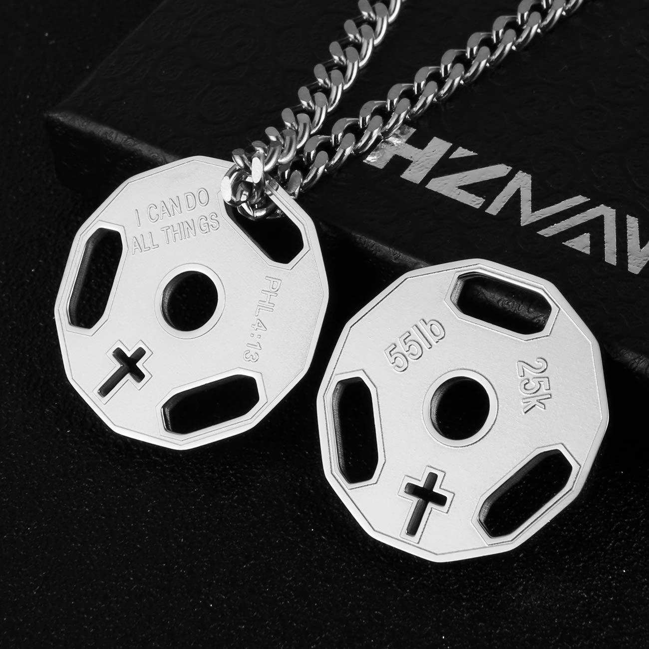 BEAUTIFULLY ENGRAVED Fitness Dumbbell Cross Necklace. An inspirational Bible verse from PHILIPPIANS 4:13 on the back. "I CAN DO ALL THINGS"