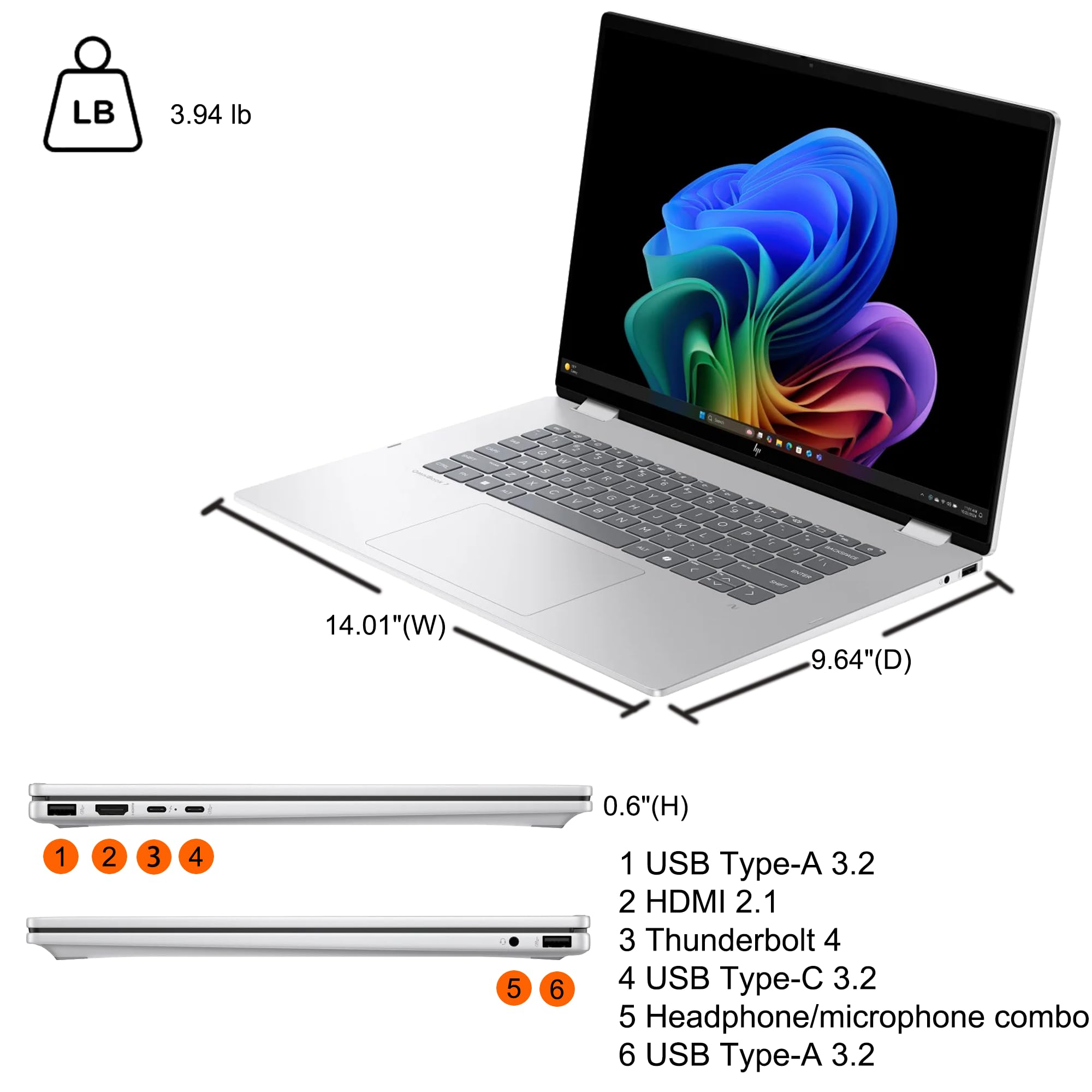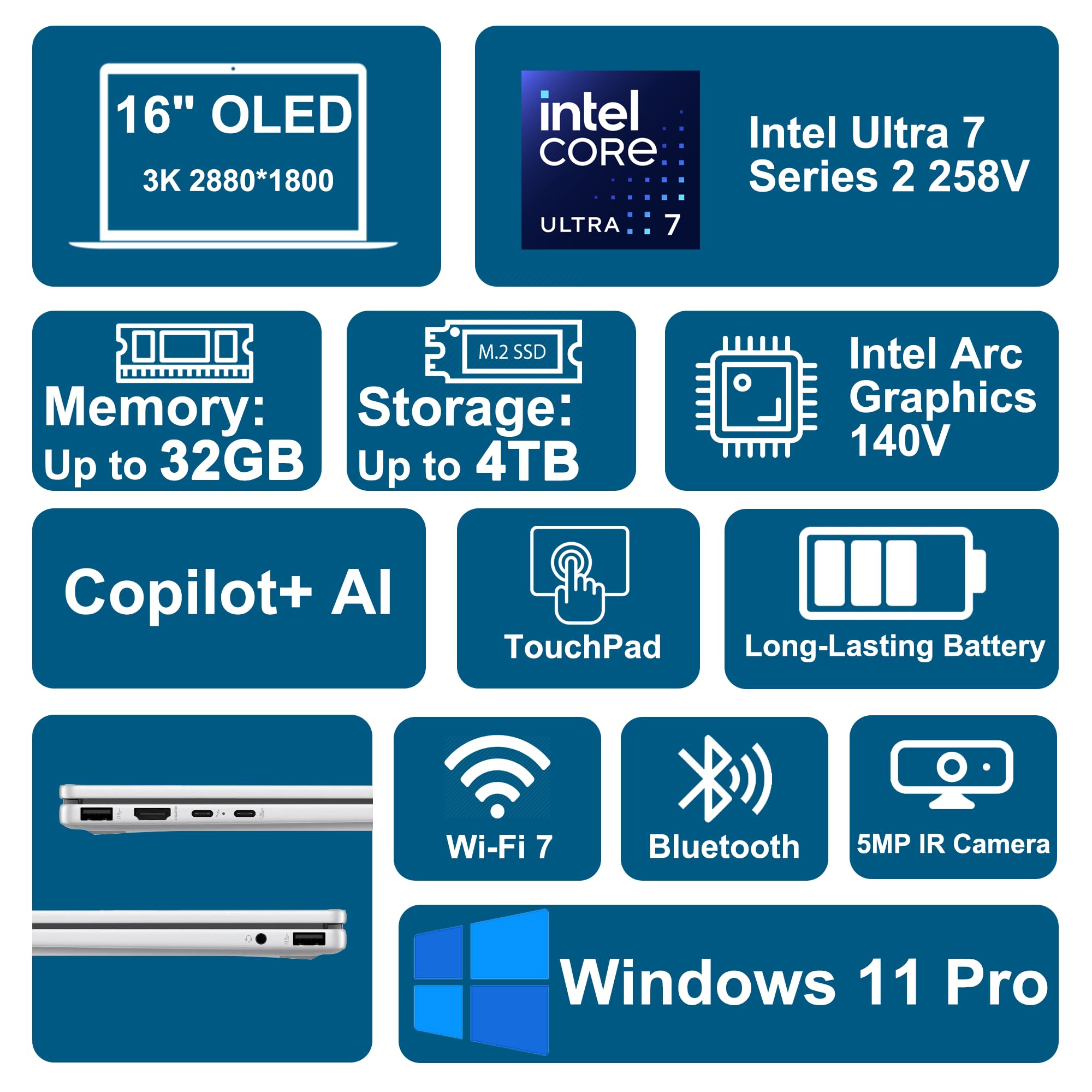 PRODUCT OVERVIEW: Product Details: Microprocessor: Intel Octa-core Ultra 7 Series 2 258V Processor (Base Clock 2.2GHz, Max Boost Clock Up to 4.8GHz, 12MB Smart Cache, 8 Threads) Memory: 32GB RAM Storage: 1TB SSD Operating system: Microsoft Windows 11 Professional Graphics & Video: Integrated Intel Arc Graphics 140V 16" 3k (2880 x 1800) OLED 120Hz Touchscreen (HDR 500 nits, 100% DCI-P3) Key Features: Backlit Keyboard: Yes Poly Studio Audio: Yes 5MP IR Camera: Yes Wi-Fi 7: Yes Ports: 1x Thunderbolt 4, 1x SuperSpeed USB-C, 2x USB-A 3.2, 1x HDMI 2.1 Battery: 68Wh Additional Information: Dimension: 9.64" x 14.01" x 0.6" Weight: 3.94 lbs