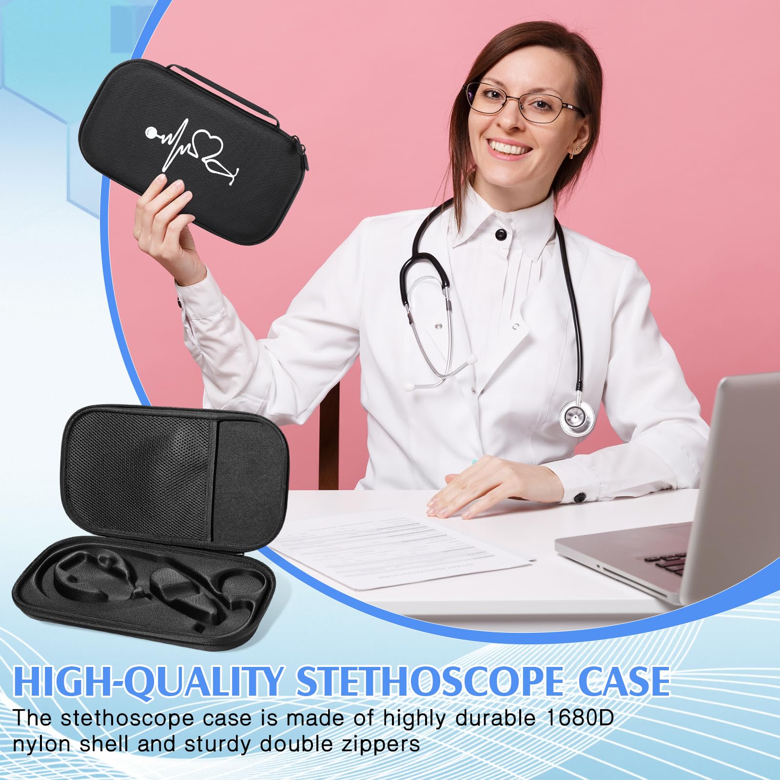 Reliable Quality: the stethoscope case is made of durable 1680D nylon fabric and sturdy double zippers, the nylon zippers are slightly waterproof, and the internal grooves can effectively fix the stethoscope to prevent the device from collision and dents