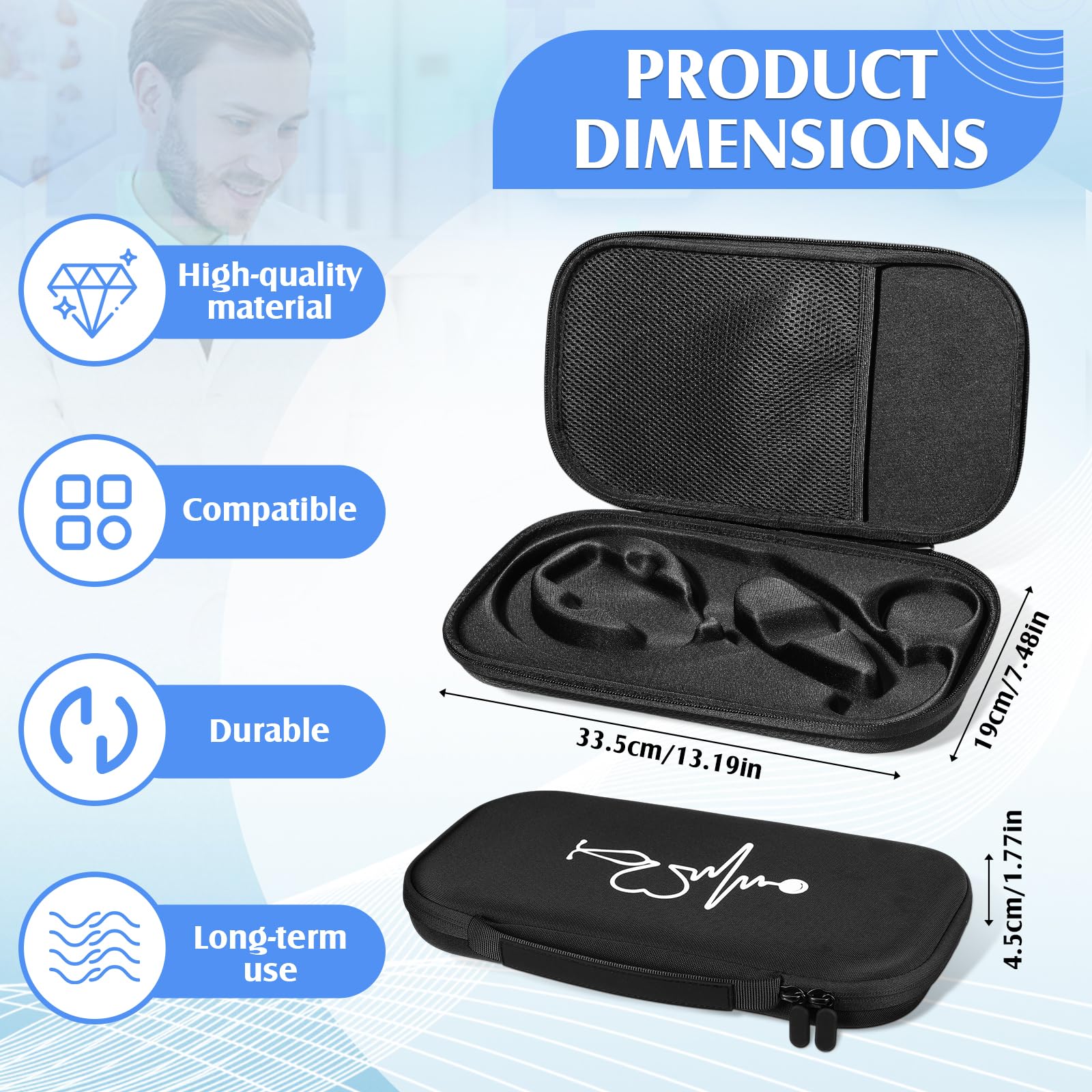 Features: Easy to carry: Our classic stethoscope case features a double zipper design to store your belongings and stethoscope safely. It comes with a shoulder strap so you can carry it with you. Good gift option: Our stethoscope bag is an ideal gift for doctors, nurses, medical students, and other healthcare professionals. Specifications: Material: nylon Color: black Size: about 13.19 x 7.48 x 1.77 inches/ 33.5 x 19 x 4.5 cm Package includes: 1 x Stethoscope Case Notes: Manual measurement, please allow slight errors on size. The color may exist a slight difference due to different screen displays. Our product is compatible with stethoscopes. Please confirm the fitting model before placing the order.