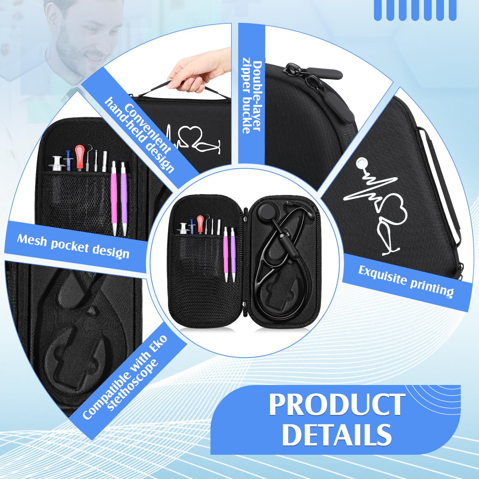Package Includes: you will receive 1 stethoscope case with print, classic stain resistant black, the print pattern is beauty and exquisite, the size is about 13.19 x 7.48 x 1.77 inches/33.5 x 19 x 4.5 cm, large enough to hold your stethoscope