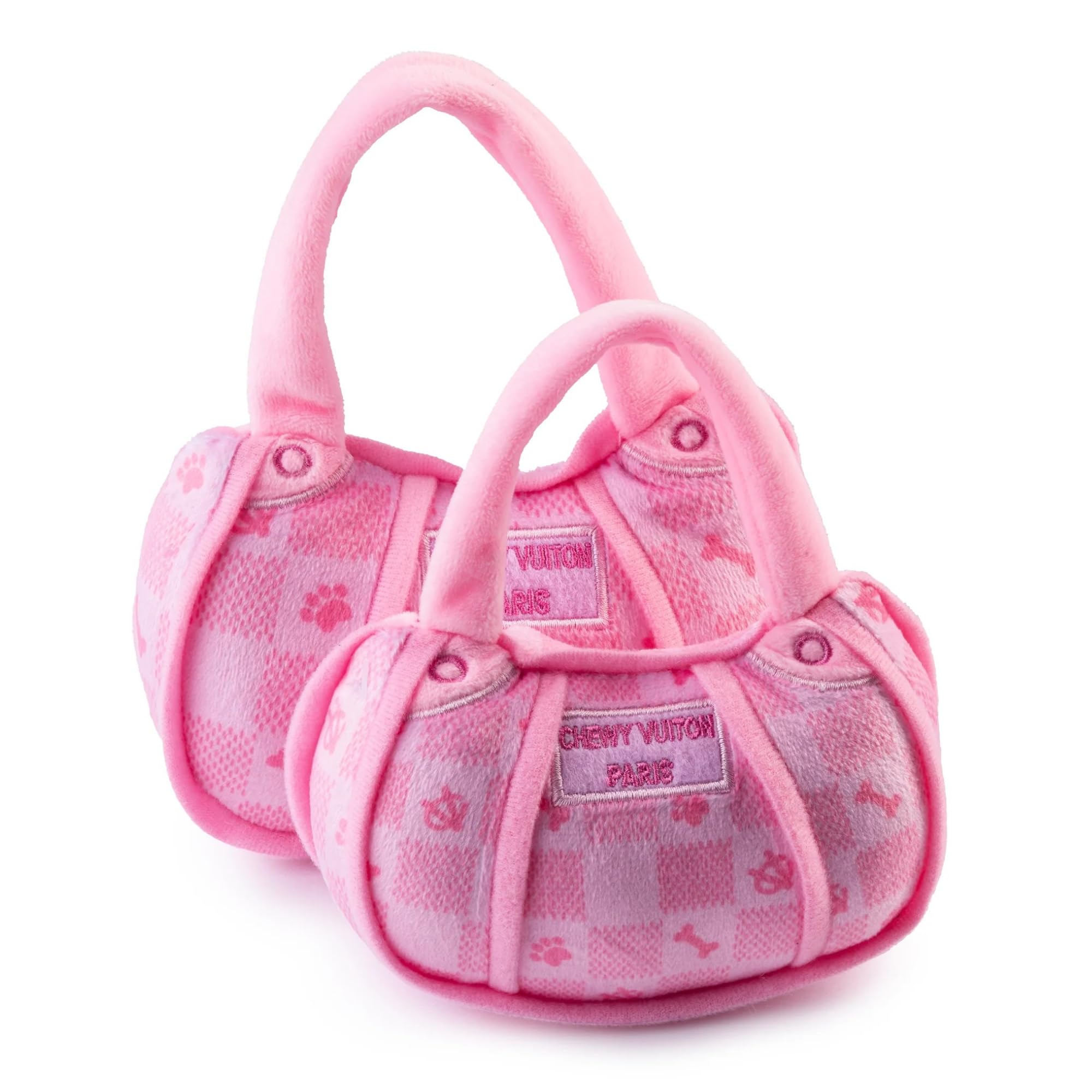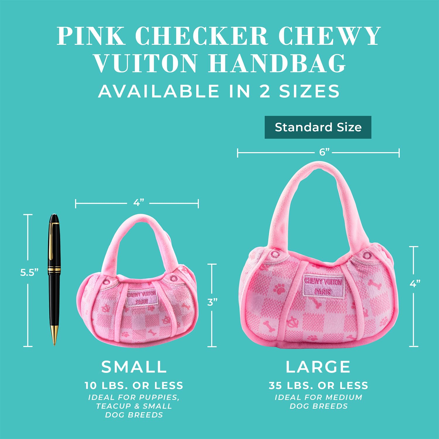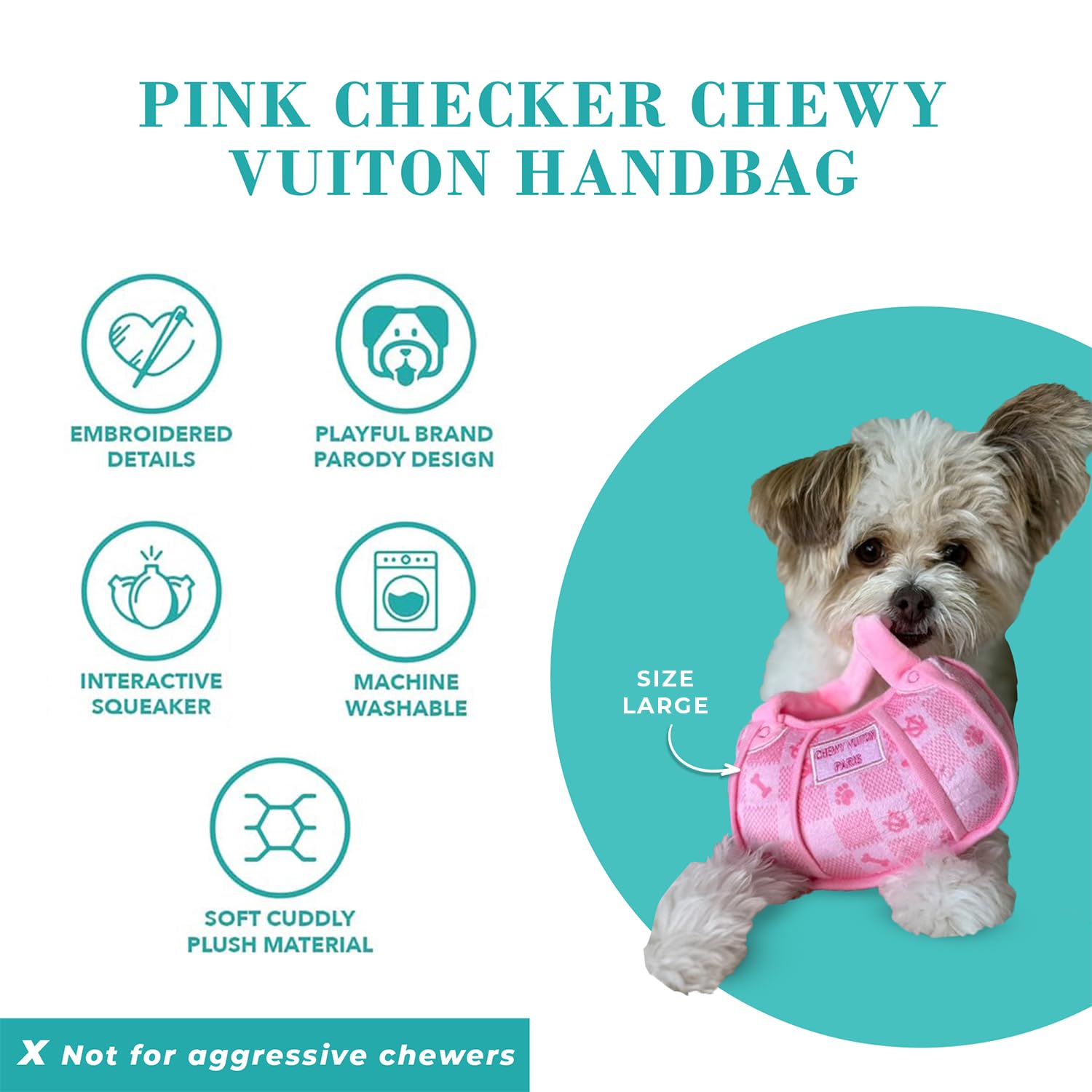Funny Parody Plush Dog Toy: Let your furry fashionista fetch some fashion-forward fun with this Pink Checker Chewy Vuiton Handbag dog plush toy, featuring a stylish pink and white checkered pattern on the soft plush exterior and a built-in squeaker hidden inside; it’s a playful, cute squeaky dog toy that combines style and fun, measuring 6"x4”x2”