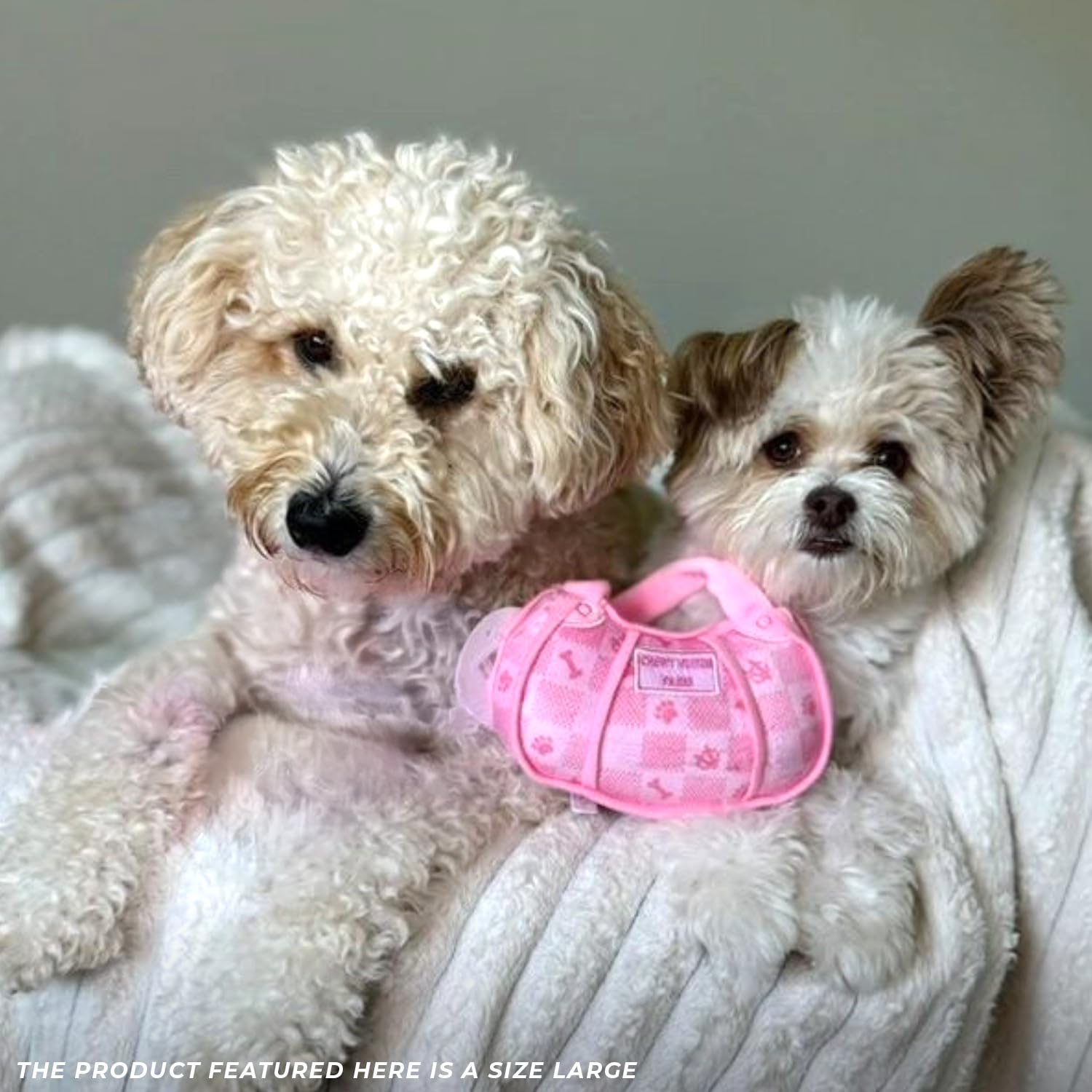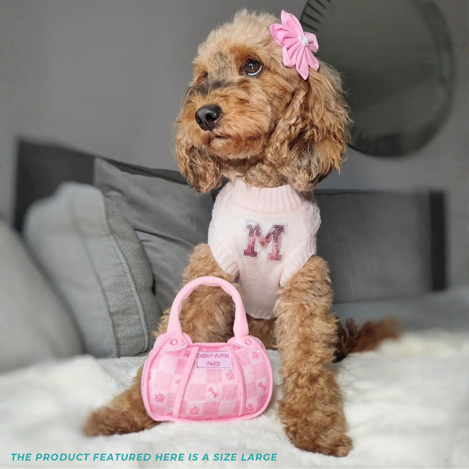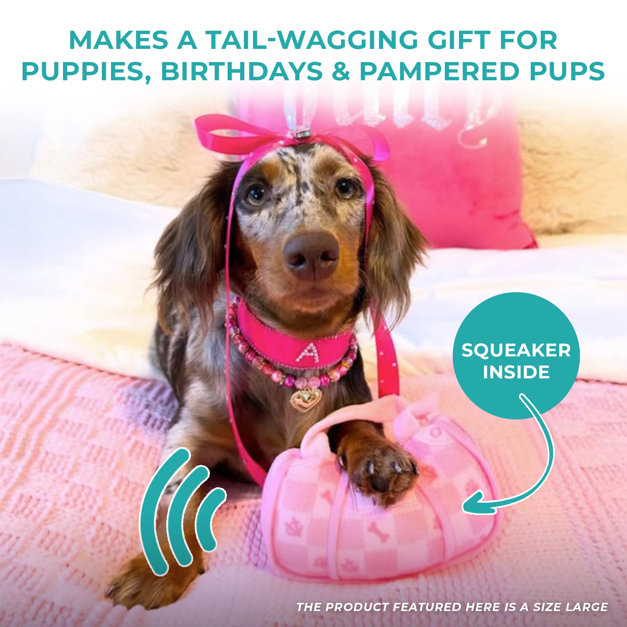 Funny Parody Plush Dog Toy: Let your furry fashionista fetch some fashion-forward fun with this Pink Checker Chewy Vuiton Handbag dog plush toy, featuring a stylish pink and white checkered pattern on the soft plush exterior and a built-in squeaker hidden inside; it’s a playful, cute squeaky dog toy that combines style and fun, measuring 6"x4”x2”