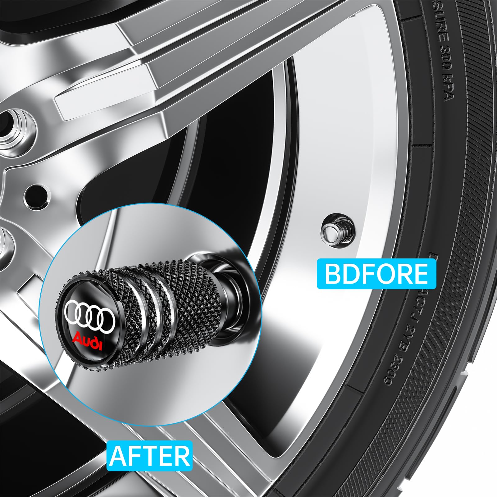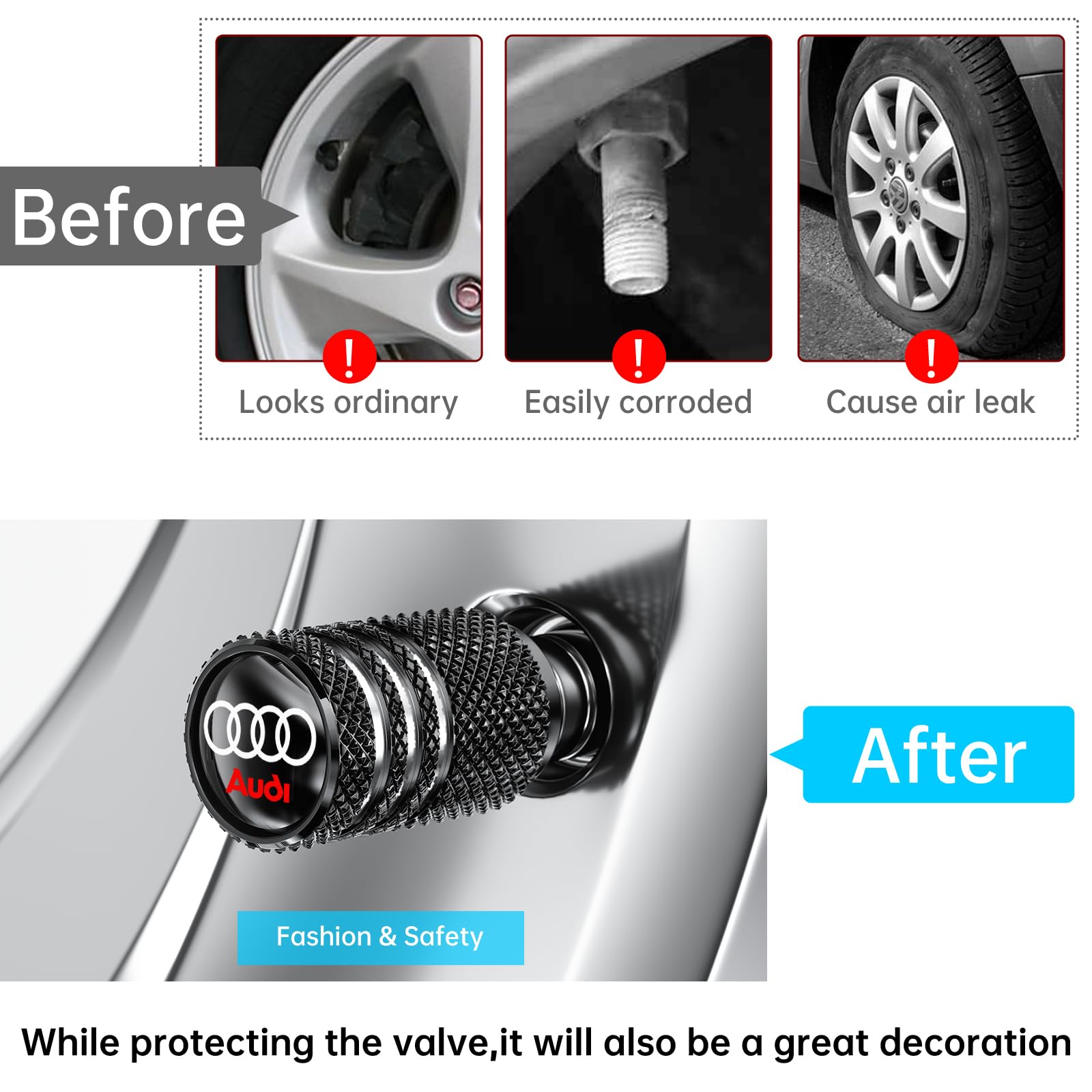 Package Included: 4 pcs Tire Valve Caps Size: 10x10x16mm,Universal Application for Most Vehicles/ Cars/ Trucks/ Pickups. Unique,Stylish and Lustrousd: Our tire valve comes in stylish, unique and lustrous design. will give your car a unique eye-catching look and will make you stand out from the crowd. Air tightness: The rubber O-ring offers long-lasting protection and an airtight seal, and it wont break or dry out and break even with proper long-term use.Wide Compatibility: Standard 8V1 Thread Universal fit for Cars, SUVs, Bike and Bicycle, Trucks, Motorcycles. Warm Notice: To prevent the metal valve cap from fusing with the tire valve stem, please apply grease lubricant onto the threading of the valve stem prior to installation. Aluminum valve caps would be locked if they stay in acid or alkaline liquid environment for a long time, please loosen them at least once per month.