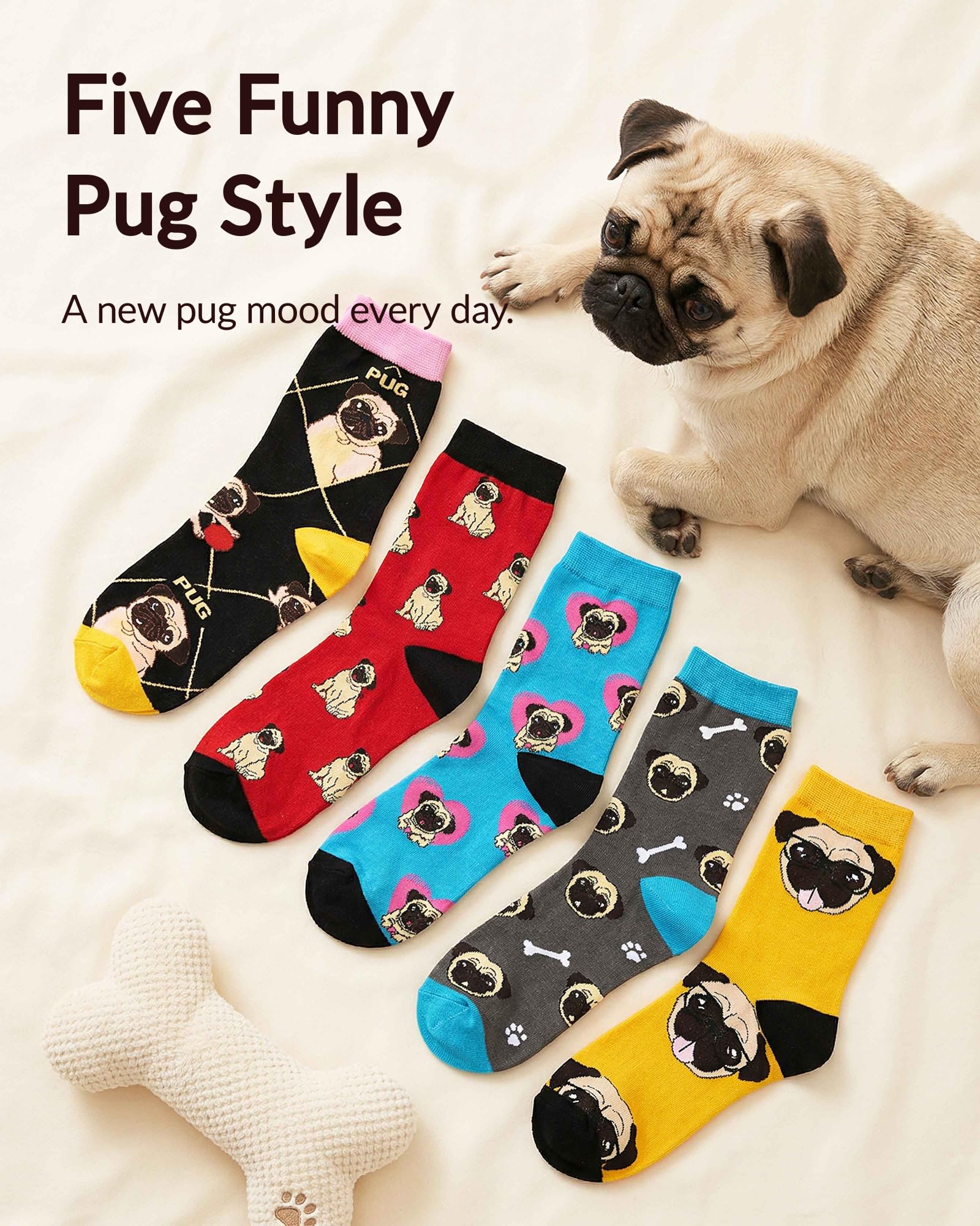 5 PAIRS PUG SOCKS -- Very colorful and attractive pug pattern socks. Every pair of socks with different colors and patterns. Fun and cute enough to get compliments!