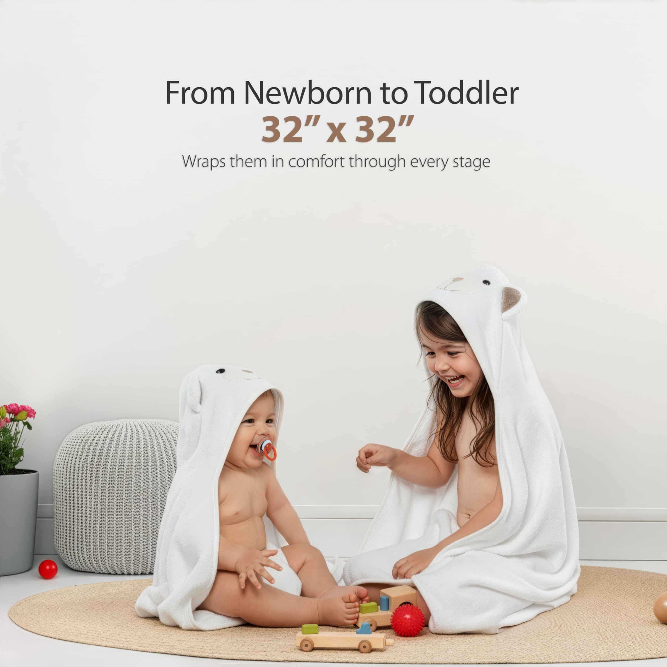 Large Hooded Towels for Baby - Measuring 32"×32", these hooded baby bath towels fit newborns, infants, toddlers, and kids up to age 5. A hooded baby towel made to last through every stage.