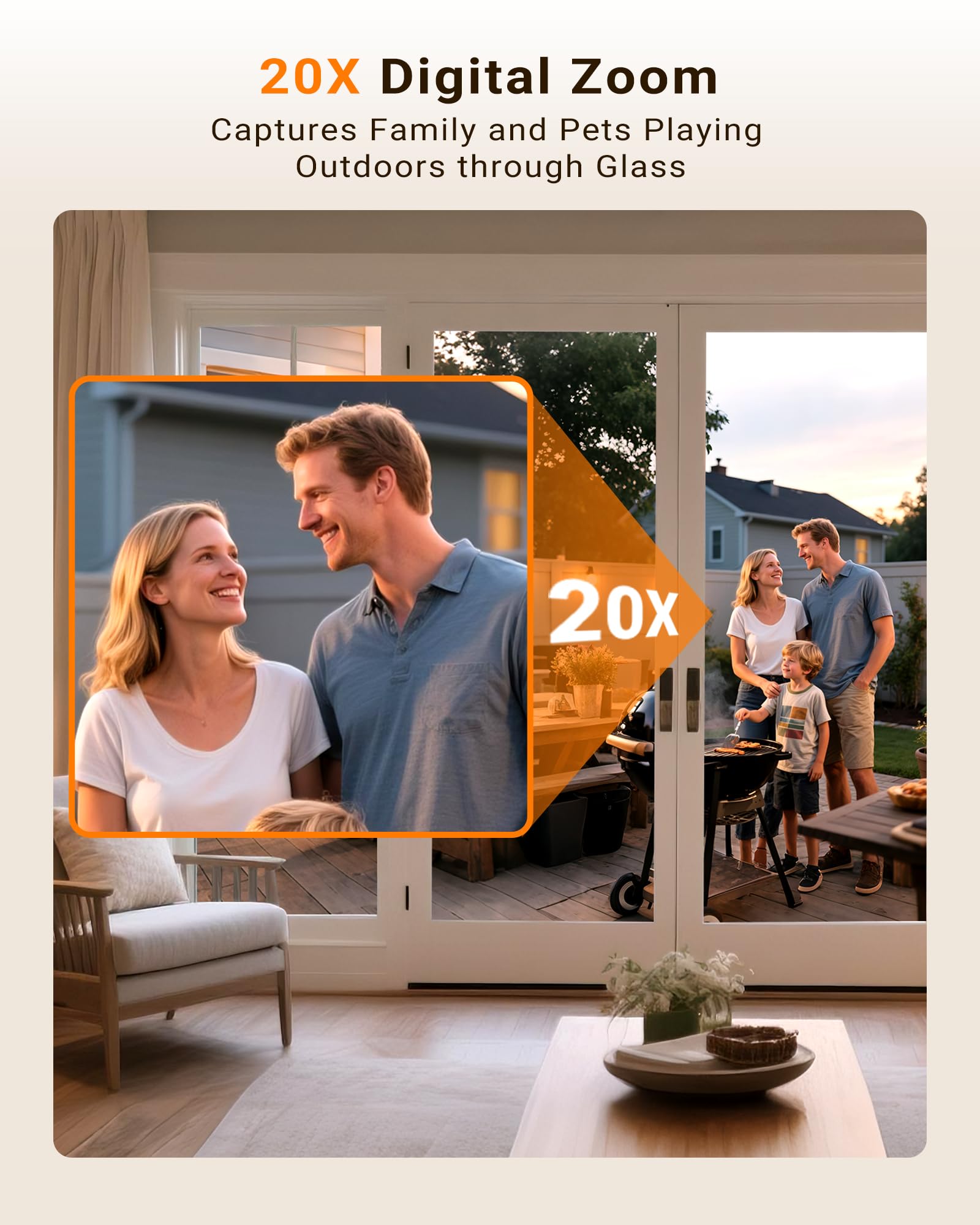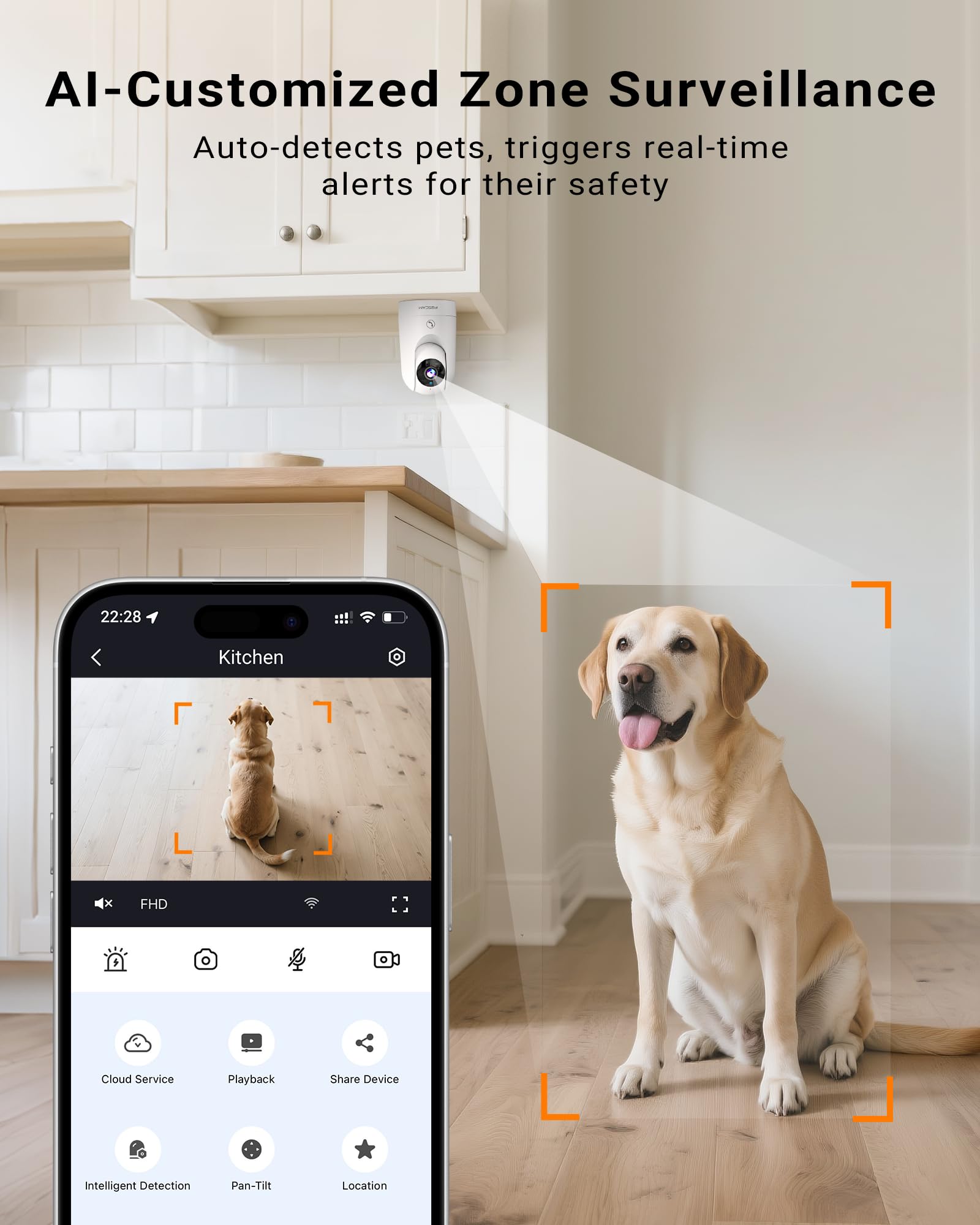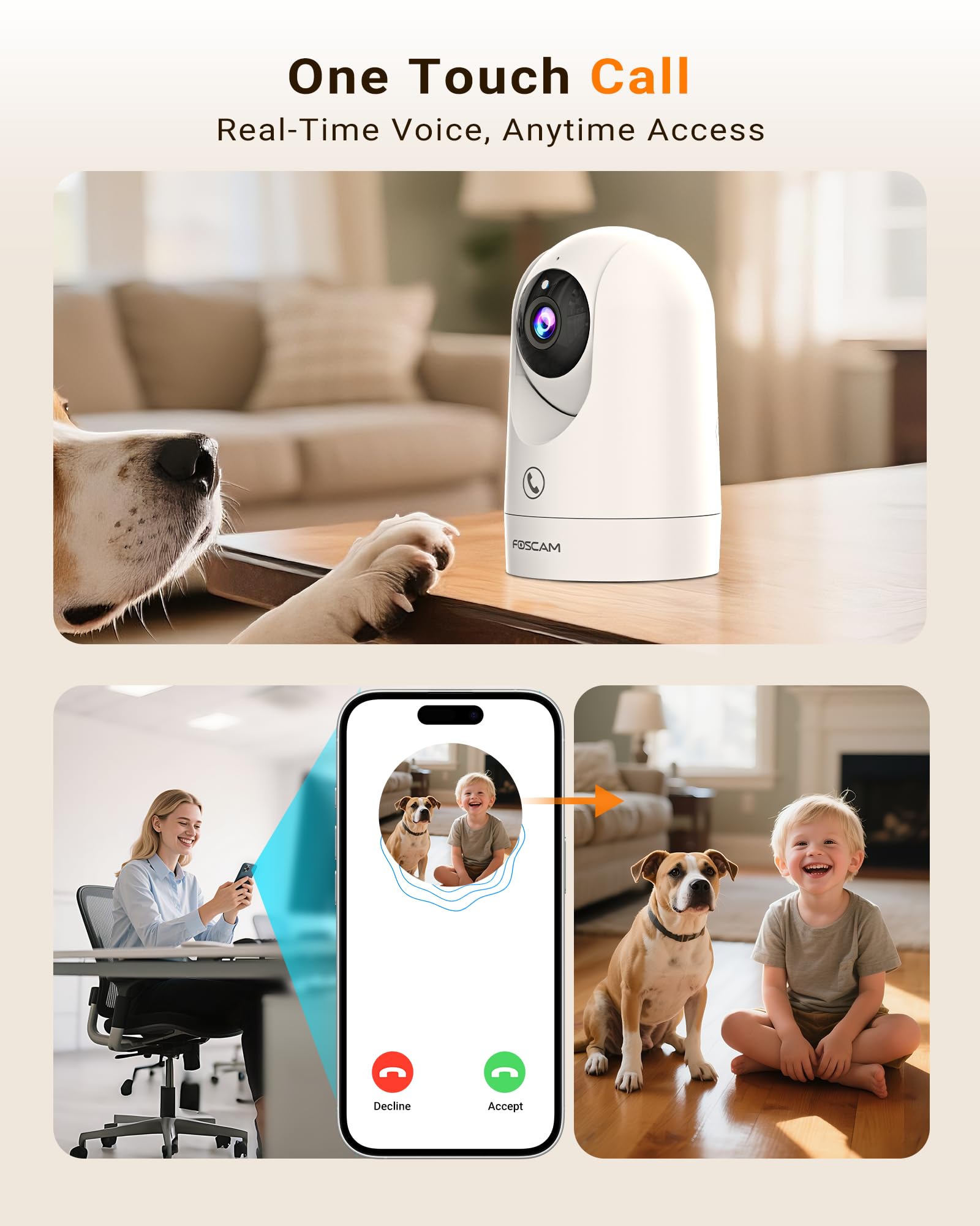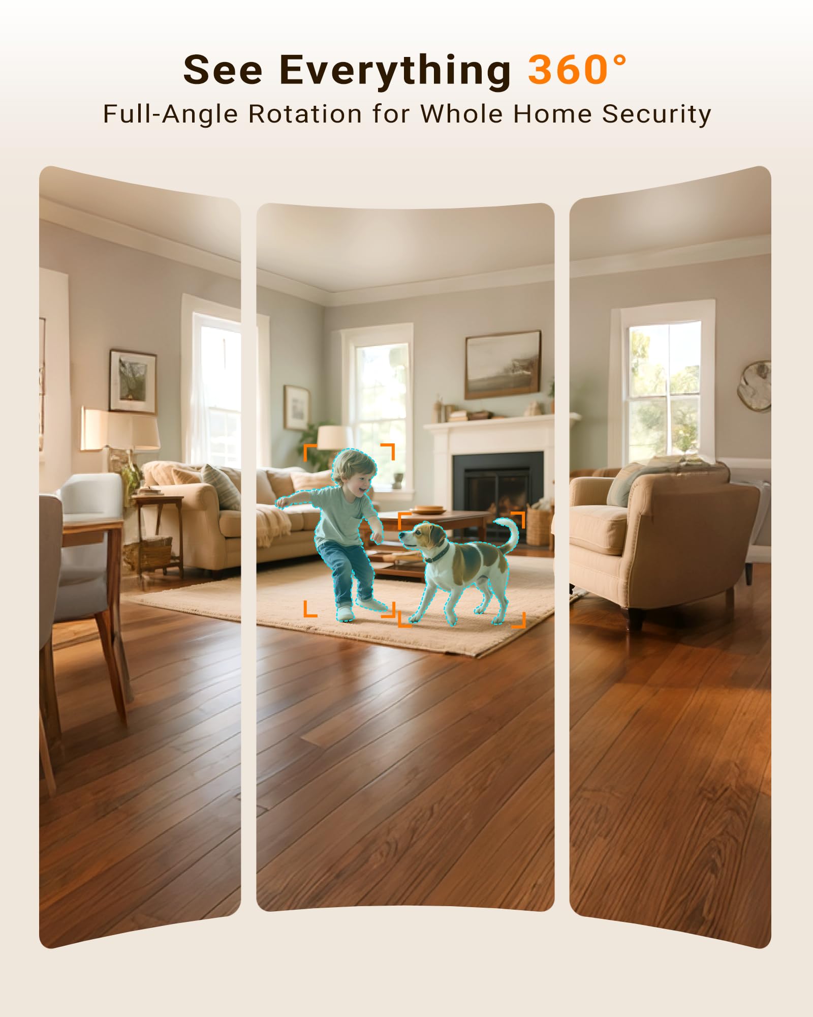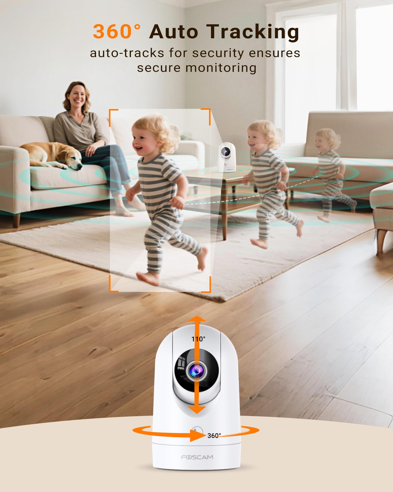 【360° Auto Tracking】When the Foscam R8M camera detects human motion, it will focus and follow the moving person, making sure the guys are always in the picture and ensuring more focused and reliable home security.