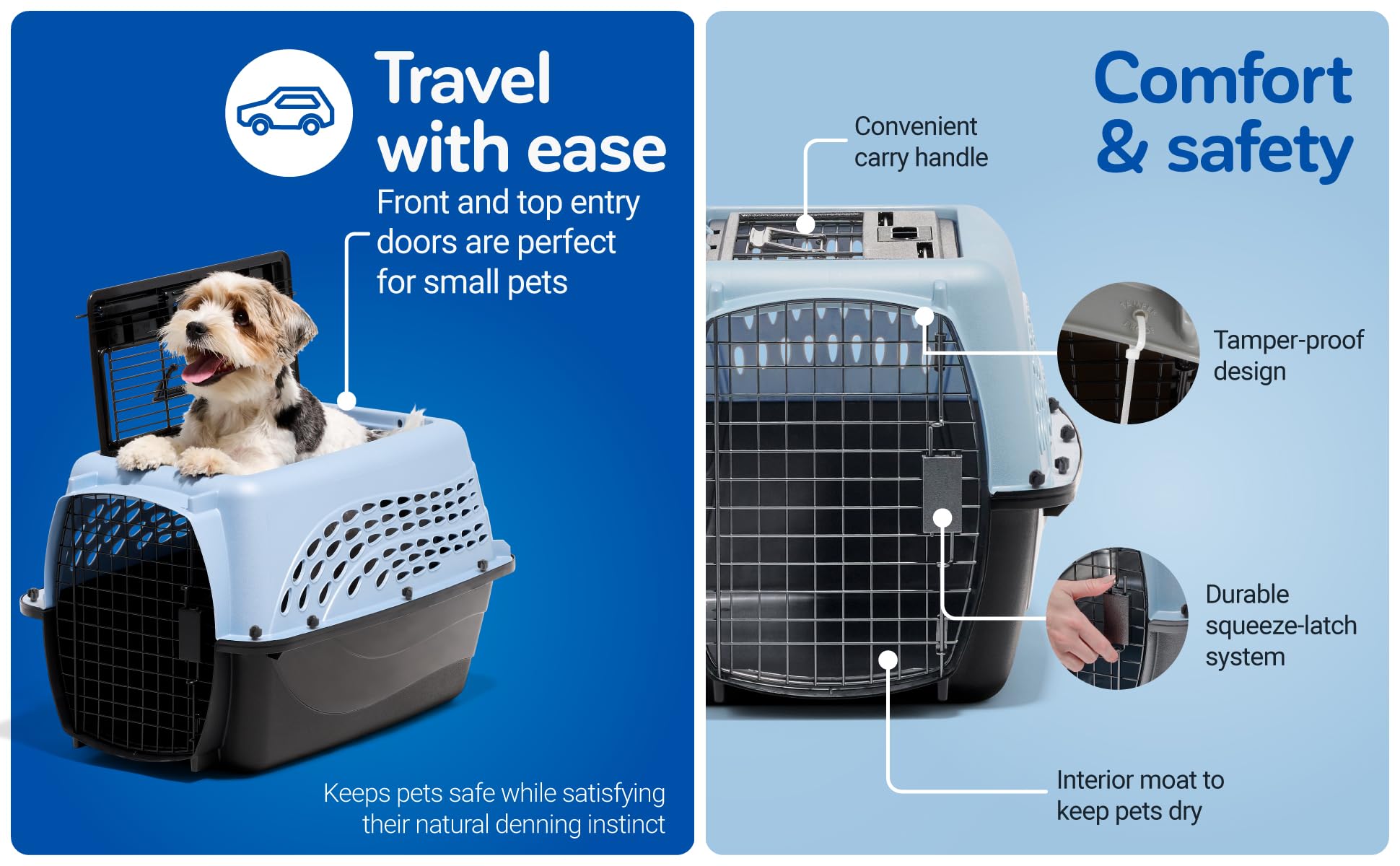The Petmate Two-Door Dog and Cat Kennel is a reliable small pet carrier well-suited for travel with pets up to 15 pounds. This versatile pet carrier is ideal for both small dogs and cats, featuring top and front-loading doors for easy access and convenience. As an airline approved pet carrier, it fits most airline specifications. The dog car carrier design is excellent for car trips, with secure latches and a foldable handle that makes transport easy. Ventilation holes on all sides help your pet stay comfortable with fresh airflow and full visibility; minimizing travel anxiety whether you're using it as a dog travel crate or cat kennel. Cleaning is hassle-free with its sturdy plastic shell, and the interior stay-dry moat keeps your pet dry during travel. With dimensions of 24.05"L x 16.76"W x 14.5"H, this small dog kennel provides adequate room for pets to move around comfortably. Its stable design supports your pet's natural denning instincts, providing them with a comforting, snug space to rest. The Petmate dog carriers for small dogs also serve as a great dog crate for car trips or visits to the vet, groomer, or park.
