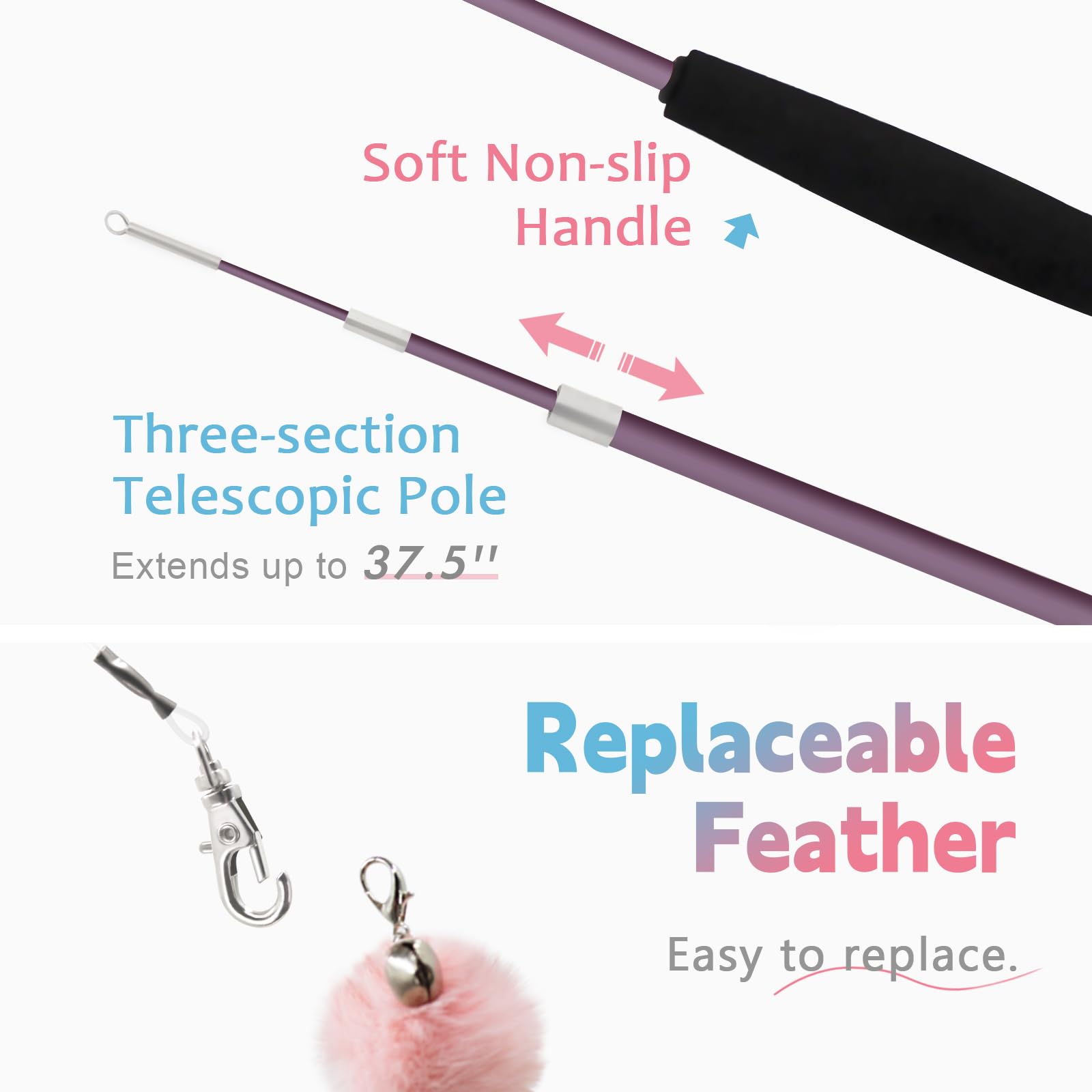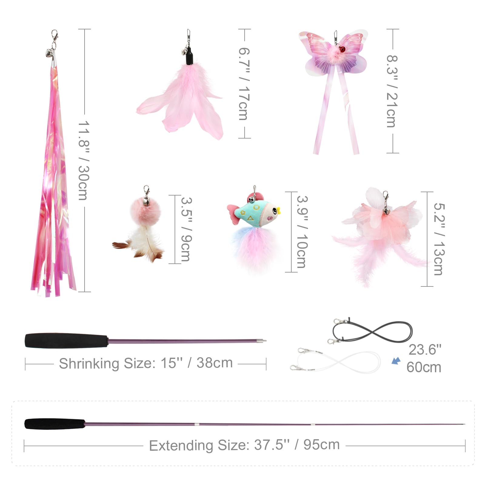 [Flexible Cat Wand] Our cat wand is sturdy and durable. It comes with a rubber non-slip handle. The pole is flexible and retractable, and can be stretched from 15 to 38 inches, easy to carry and store. The upgraded clasp on the fishing line makes it easier to replace toys