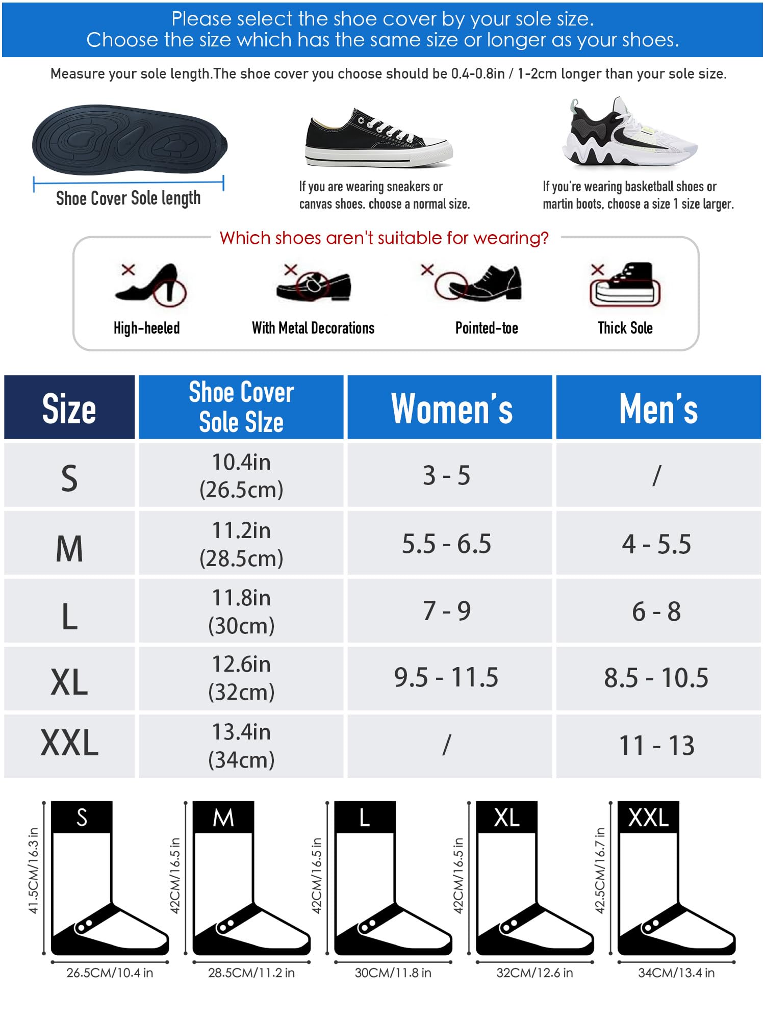 【Comfortable and easy to slip-on and remove】Waterproof full-length zipper on the side makes it very easy to slip-on and remove. The elastic strap at the top prevents the shoe covers from slipping off while walking.