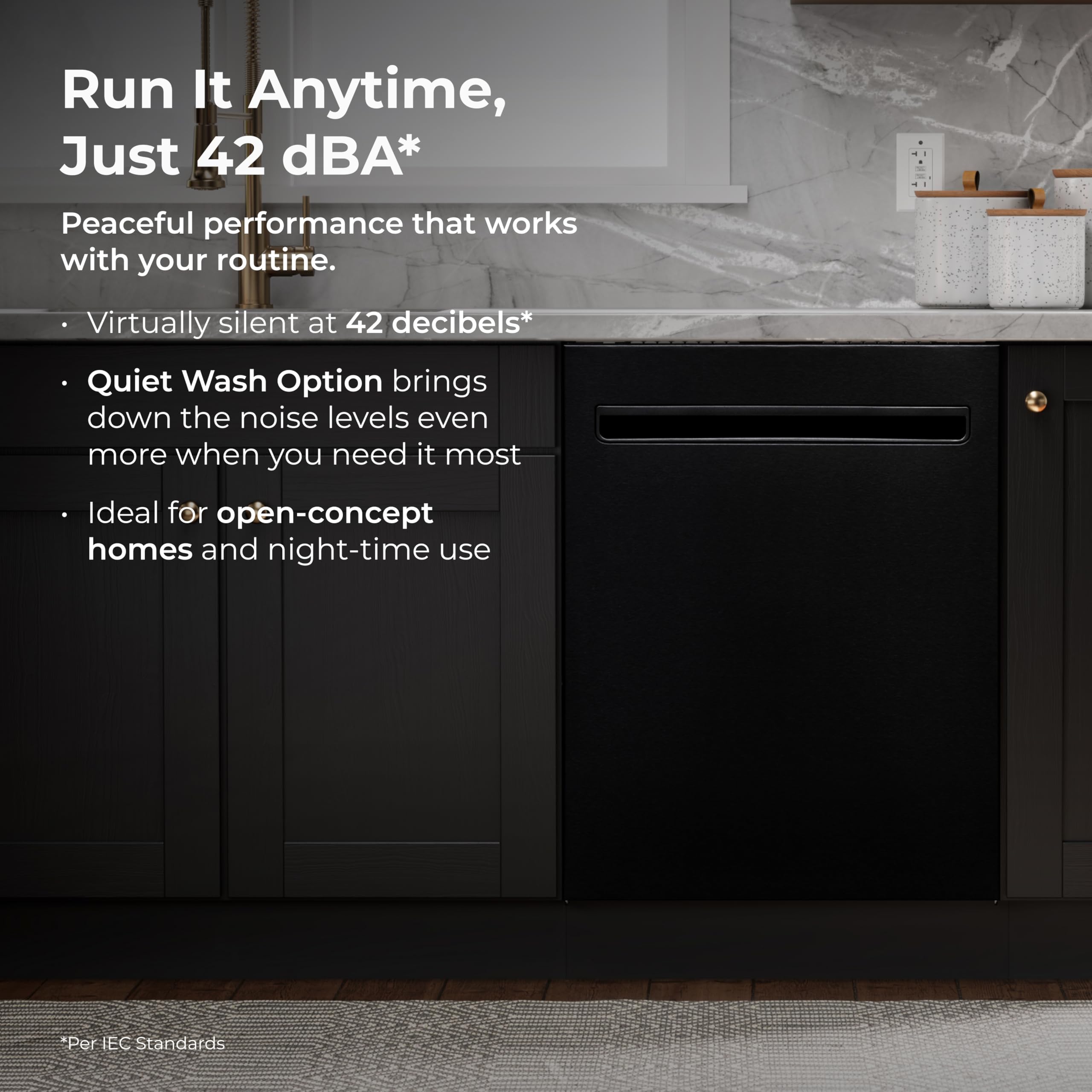 Whisper-Quiet Wash + Smart Features: This elite dishwasher runs at just 42 dBA with a QuietWash option for a whisper quiet cycle. LED floor light tells you when it's running. Hidden touch controls and a sleek bar handle offer a streamlined look