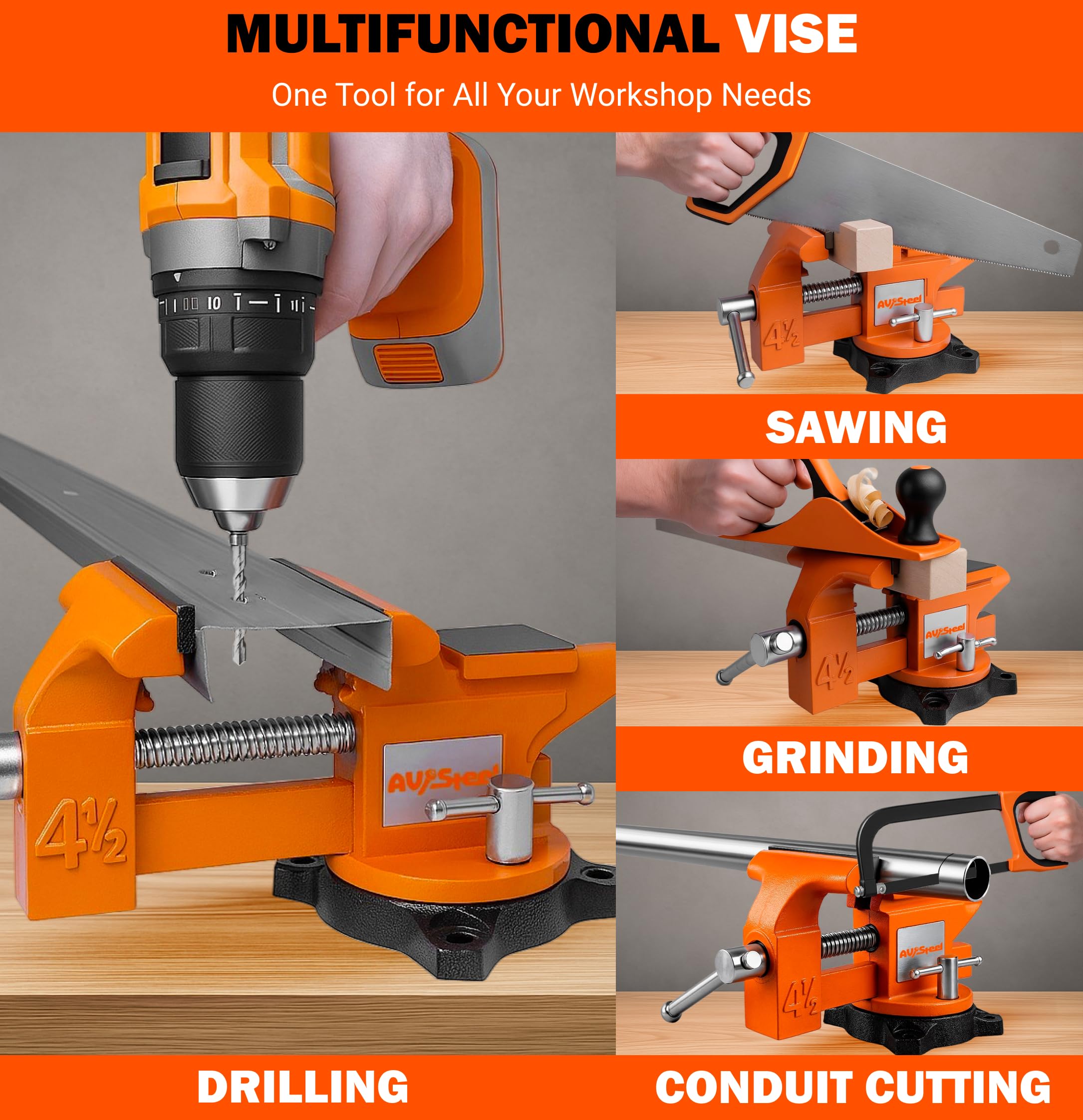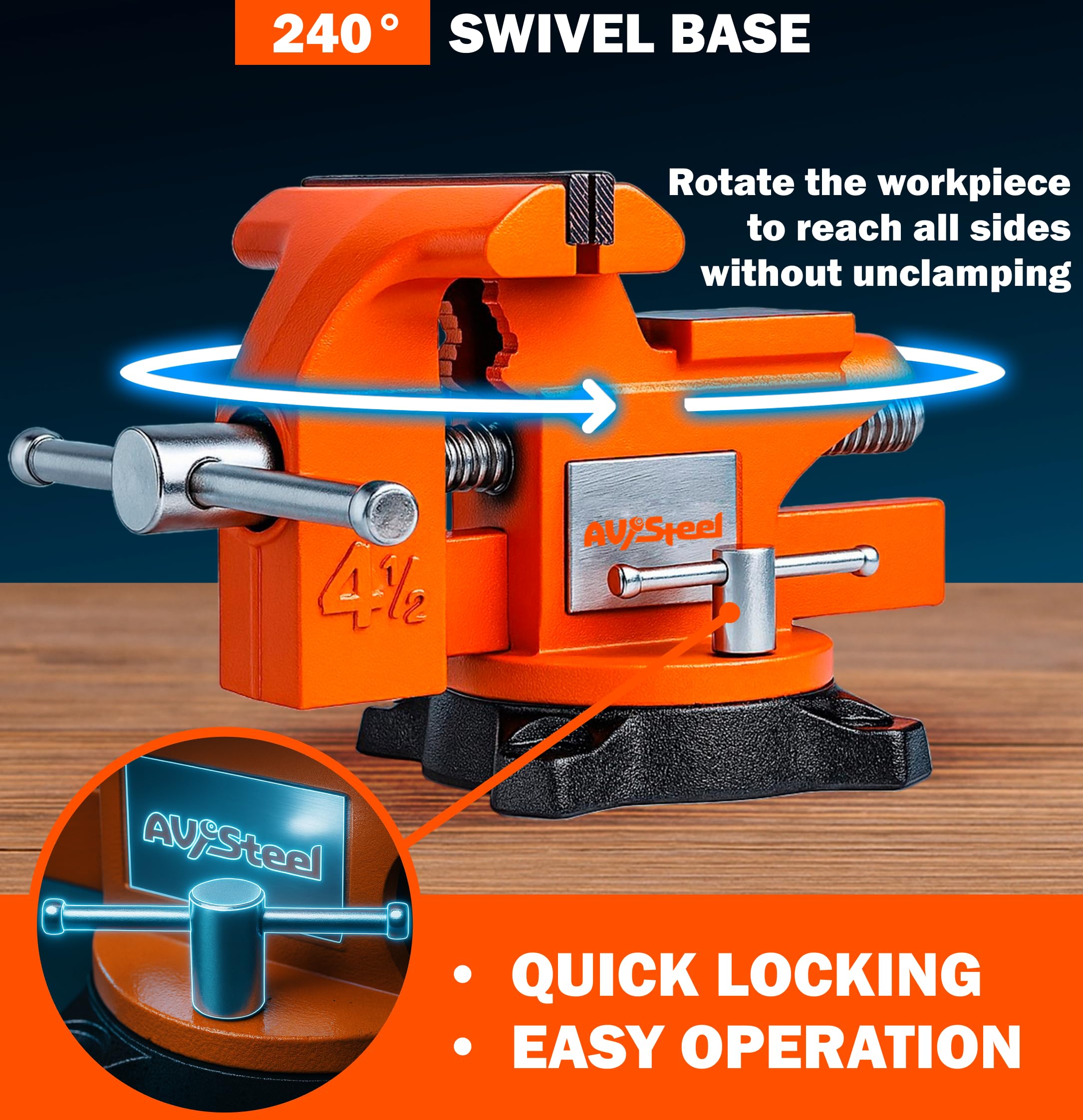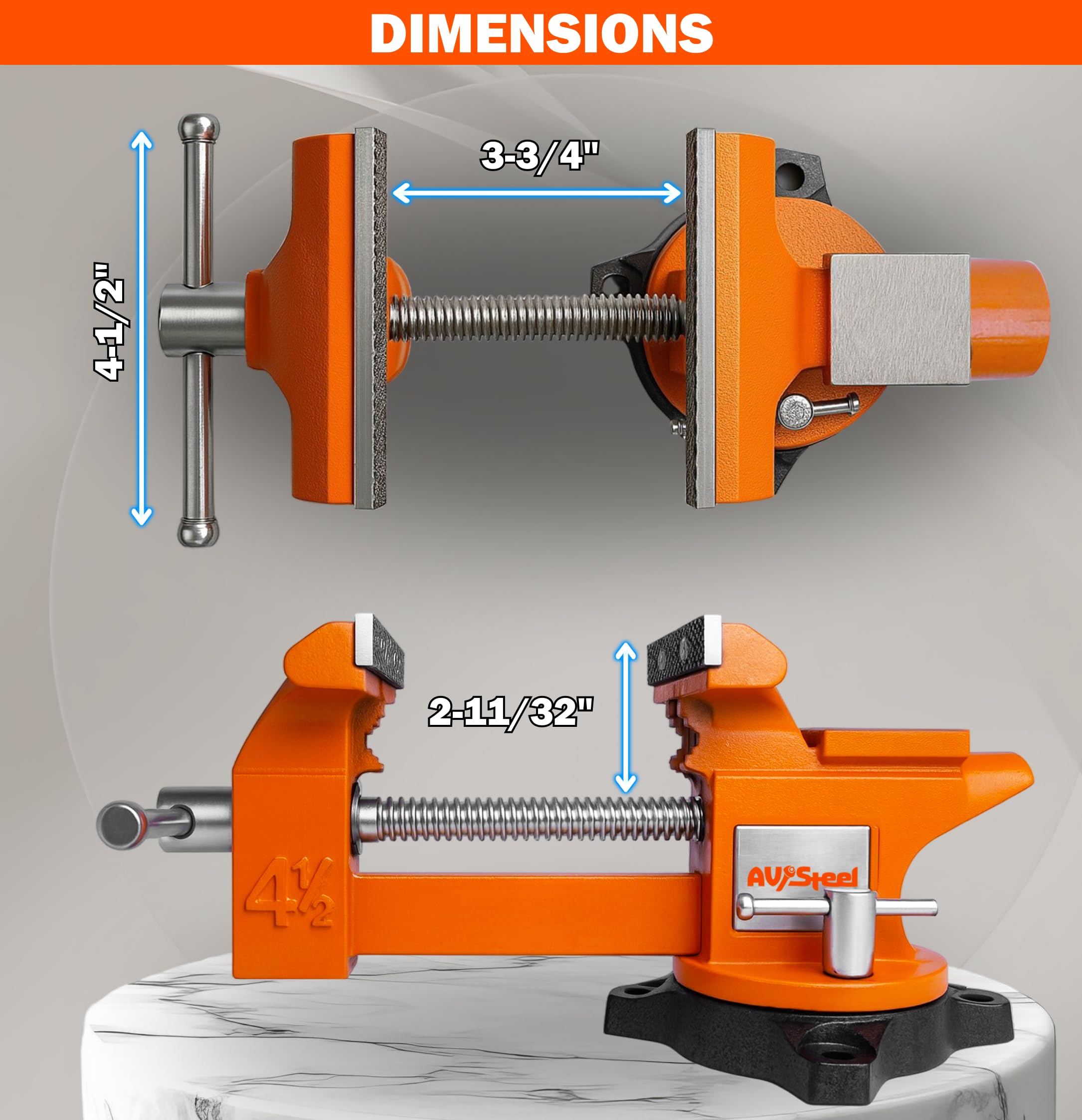 ✅ Specifications: Universal 4-1/2" bench vise has 3-3/4’’ max jaw opening, 2-11/32’’ throat depth, 5/8’’-1-7/8’’ pipe jaw range, 10.56lb overall weight, 3-1/4’’ (square) anvil dimensions. The 240° swivel base allows for flexible positioning of the tool, allowing you to work at any angle.
