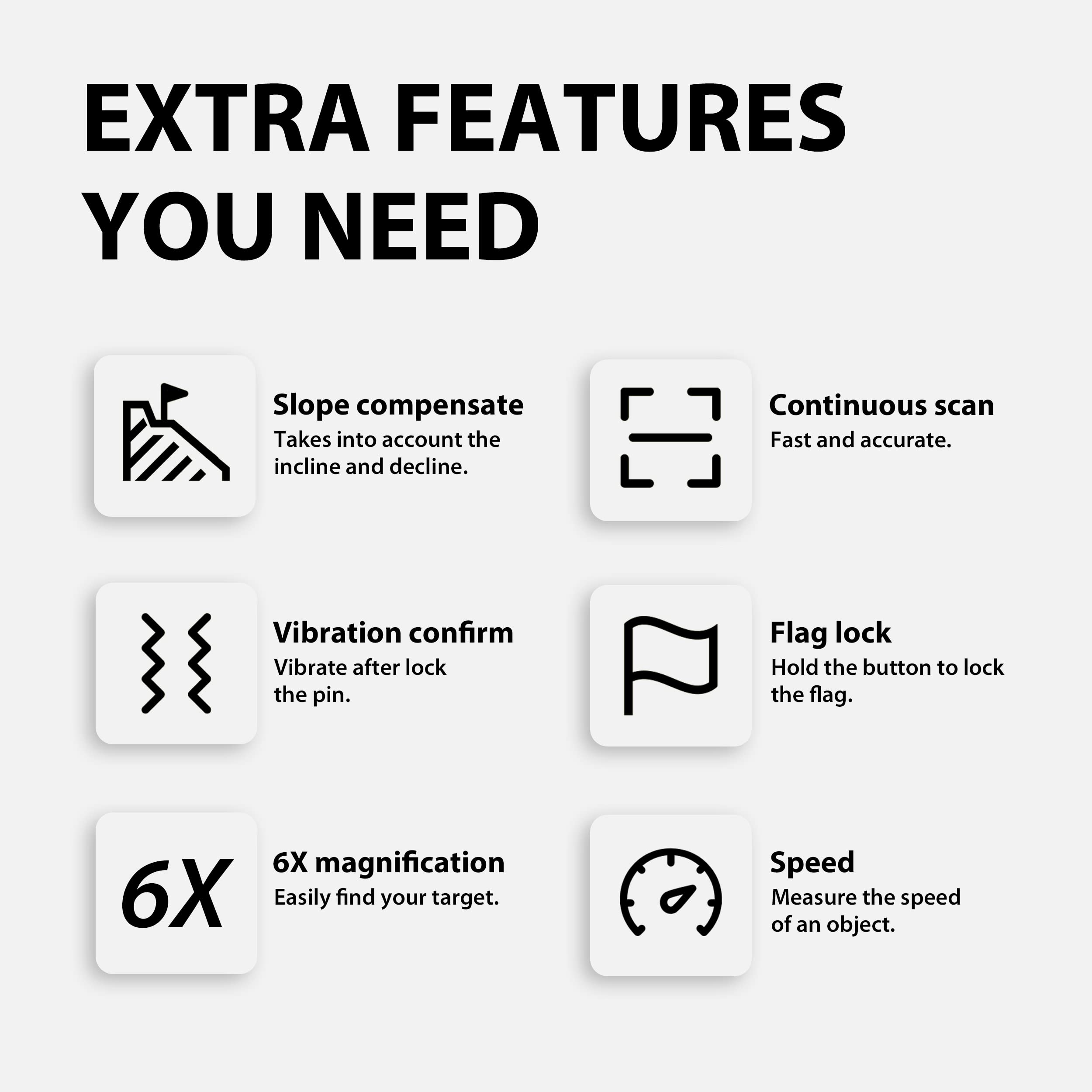THE MOST VALUABLE GOLF/HUNTING RANGEFINDER - Comes with 3 functional modes, perfect for 1000yds max distance/target measuring, Slope Distance Correction function, Vibration, 250 yards flagpole lock, 300 yards flag-lock, upgraded ultra-clear optics lens, brand-new Ggogog Sport interface. All of this makes the GS03 the most valuable and high-performance rangefinder on the market.