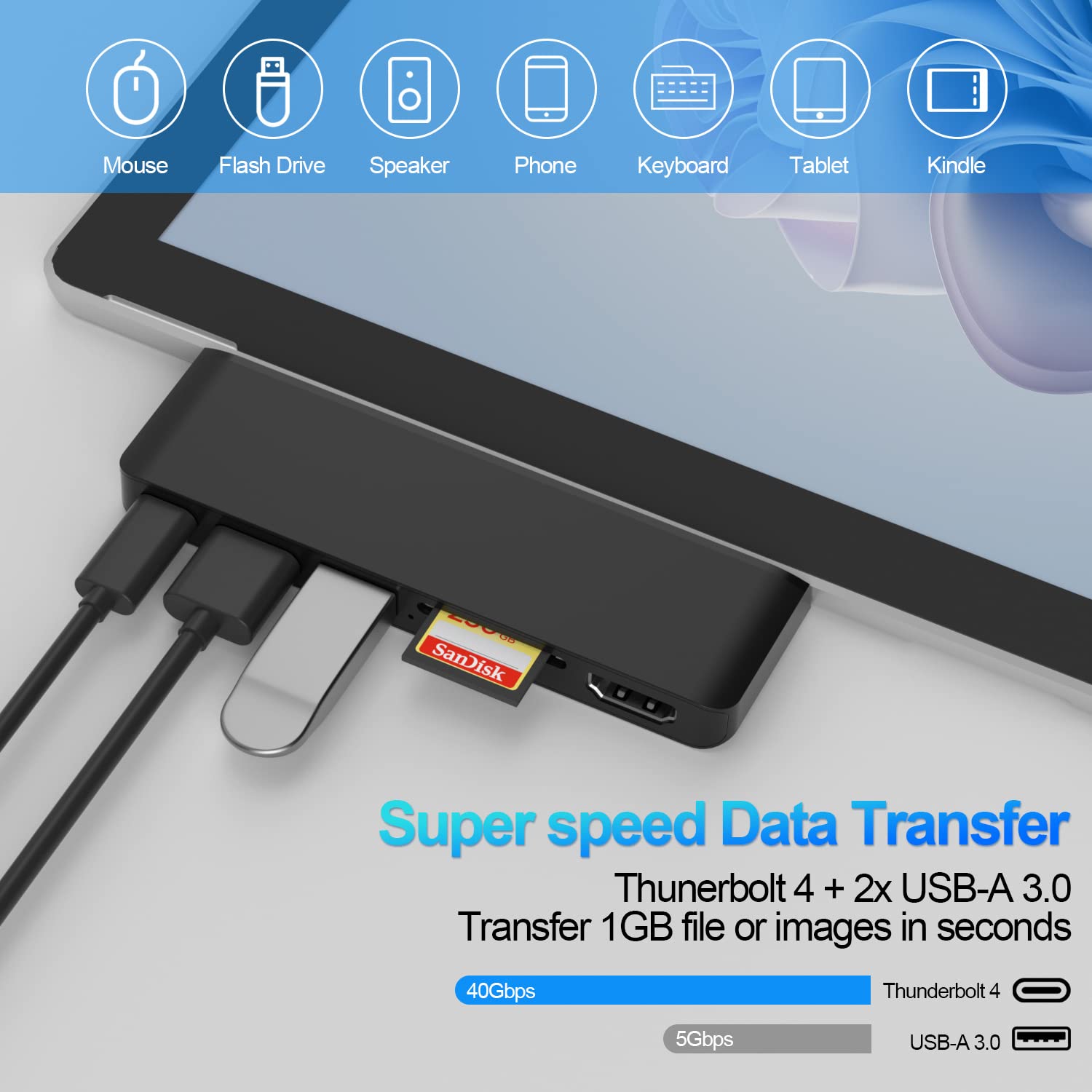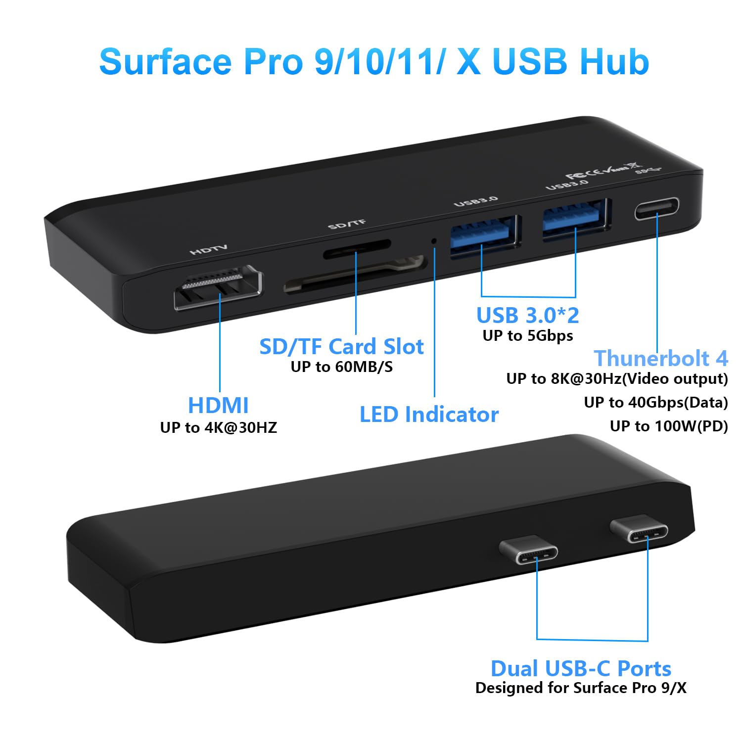 Specially designed for Pro 9/Pro10/Pro11/ProX: This Surface Pro 11 usb hub specifically developed for Microsoft Surface Pro 9/Pro10/Pro11/ProX, which turns the 2 USB-C connection into 6 ports (2 X USB 3.0 ports, 1X 4K HDMI, 1X USB C data transfer, 1X SD card reader slot, 1X TF card reader slot)(*Note 1: This Surface Pro 11 hub won't fit your Surface Pro 9/Pro10/Pro11/ProX very well if you use an protective case . *Note 2: Not compatible with Surface Go/ Surface Pro 3/4/5/6/7/8)