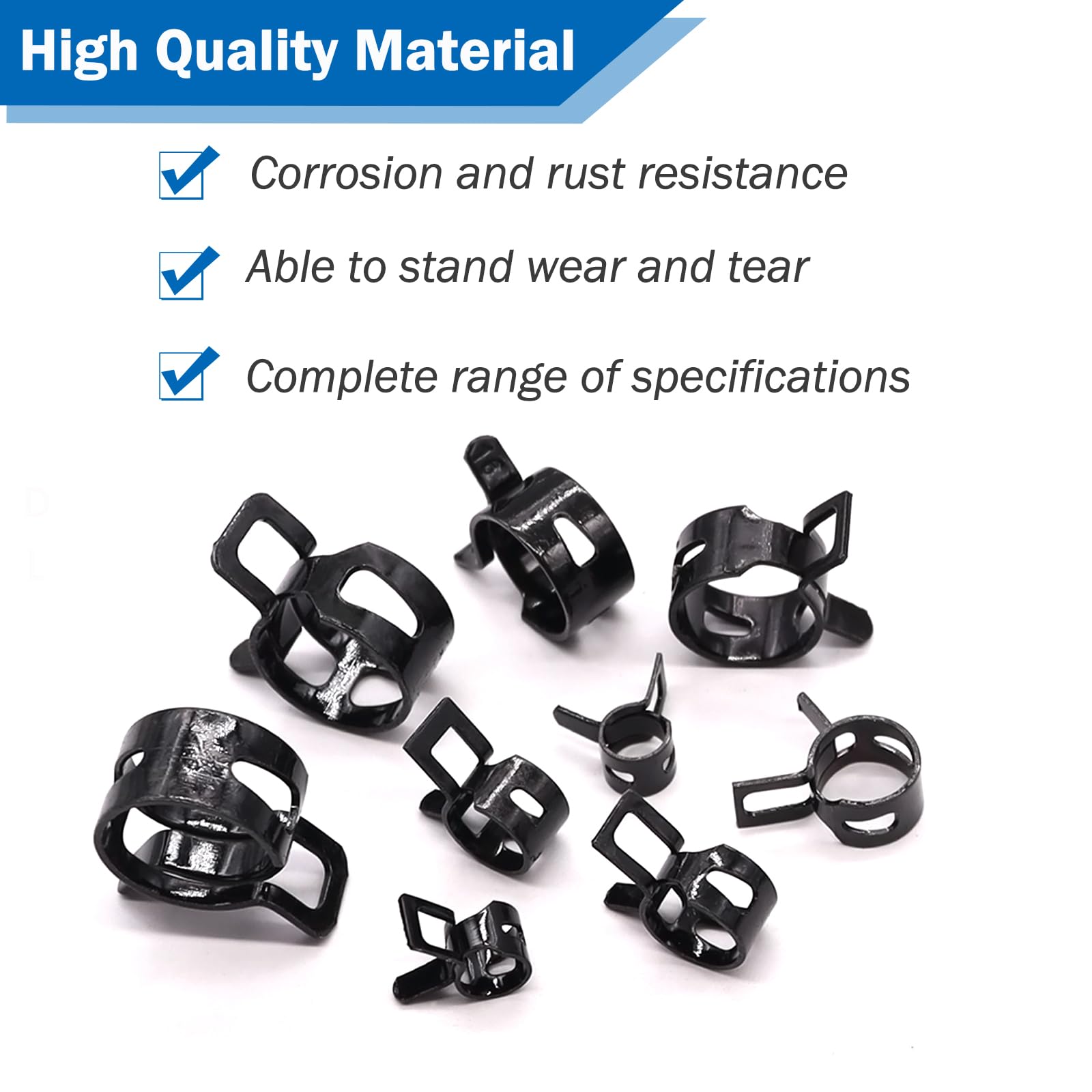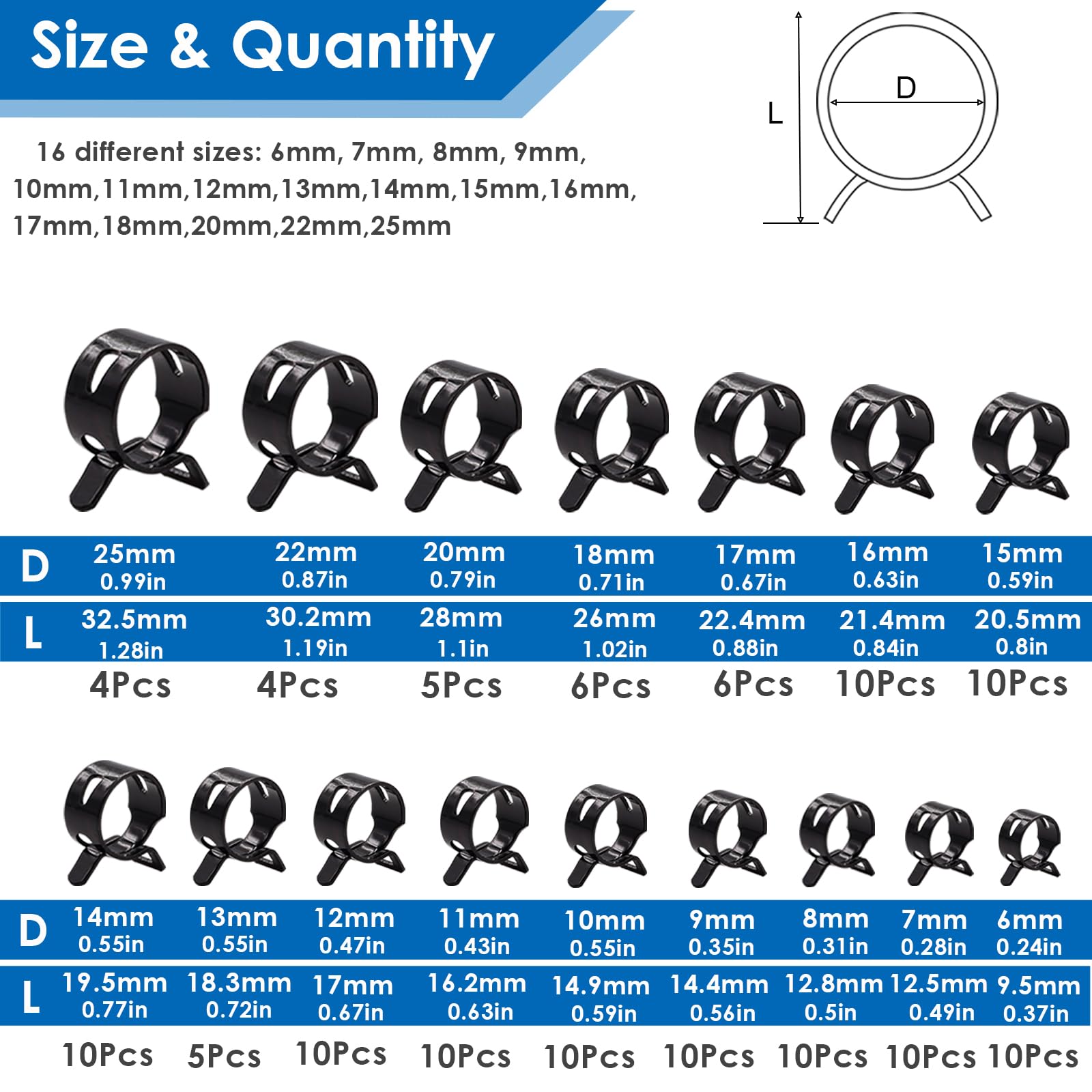 Various Styles Are Available: Spring Clamps Include 16 different diameters clamps to adapt to different hoses: 6mm, 7mm, 8mm, 9mm, 10mm, 11mm, 12mm, 13mm, 14mm, 15mm, 16mm, 18mm, 19mm 20mm, 22mm, 25mm.Come with a plastic storage box has classification figure inside, could facilitate your storage and classification size