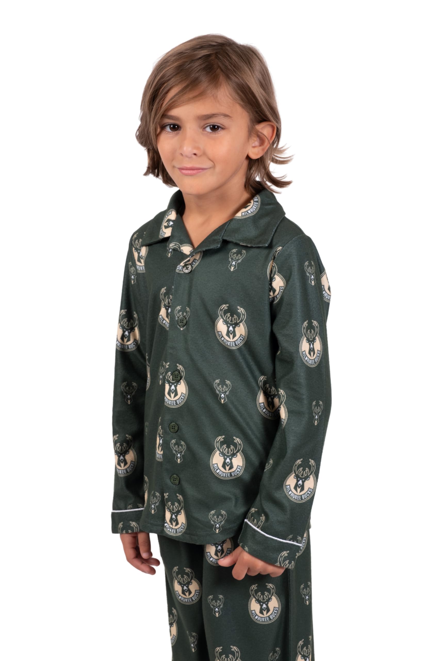 STYLISH DESIGN: This set includes a button-up shirt, elastic waistband bottoms, and an all-over print of your favorite NBA team's primary and secondary logos.
