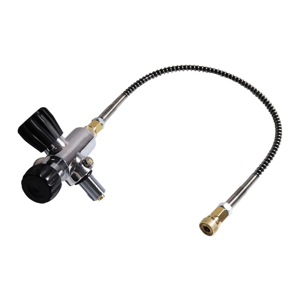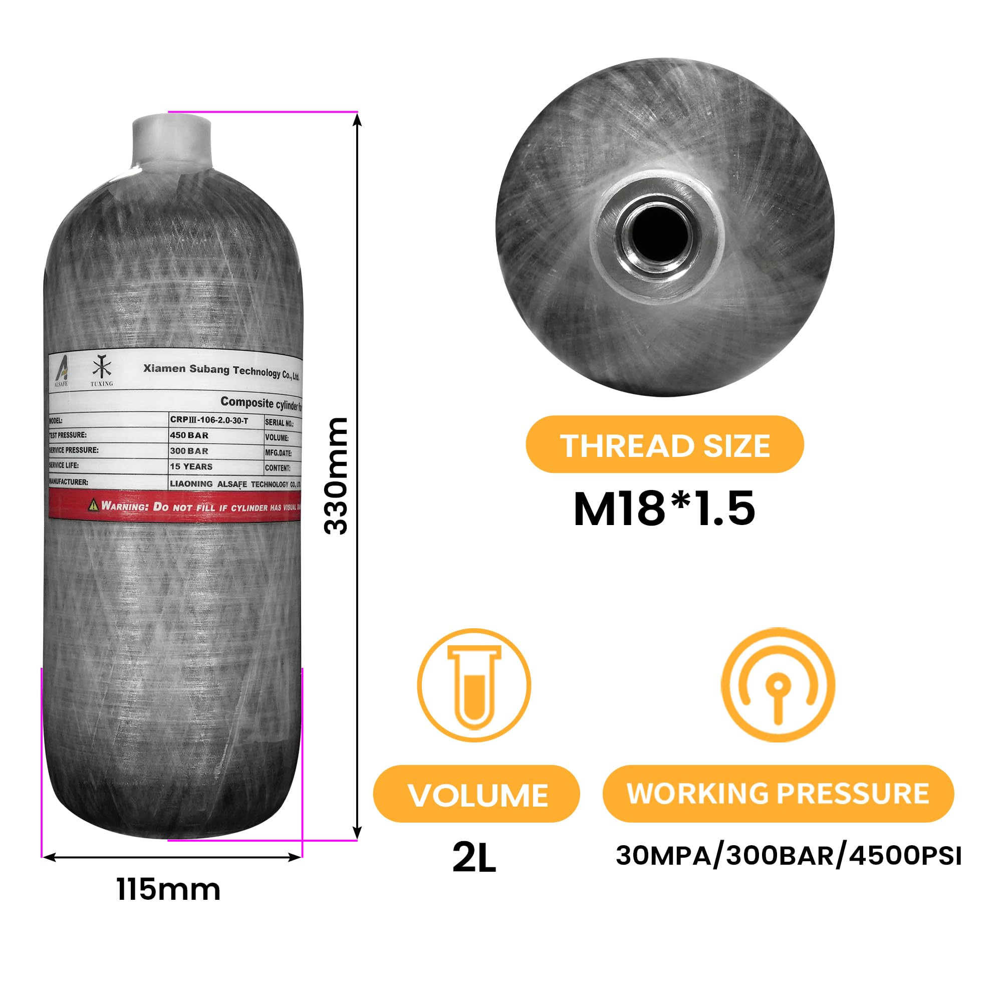 Product Capacity: Product Specification: 2L / 122Cu in capacity, 30mpa / 4500psi service pressure, M18x1.5 screw thread size, integrated air filling system with regulator gauge hose fittings for input and output by quick disconnect;