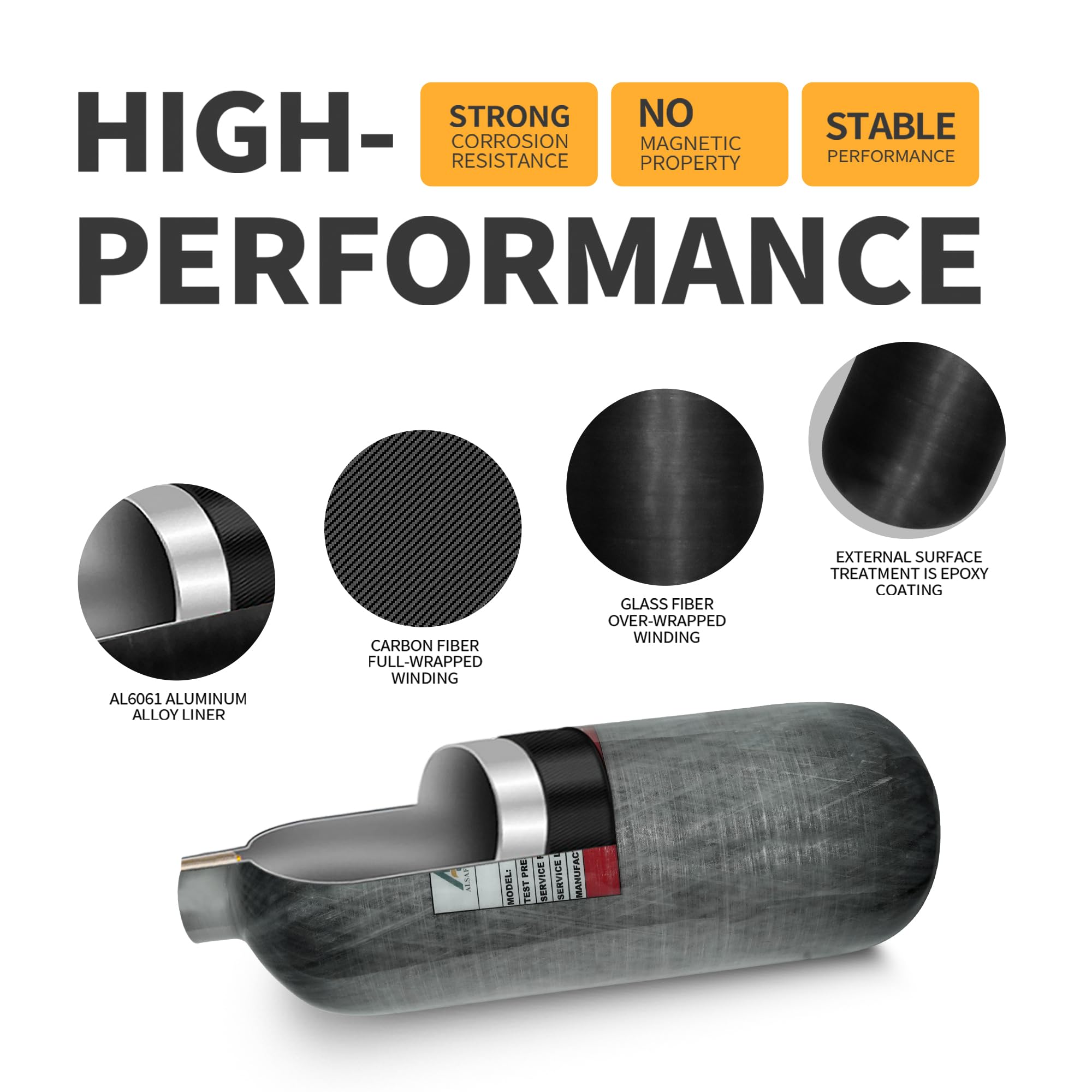 Product Structure: Using high-quality raw material AL6061 aluminum alloy liner with full-wrapped carbon fiber and glass fiber winding, external surface treatment is epoxy coated, high strength features creep resistance, shock resistance and corrosion resistance;