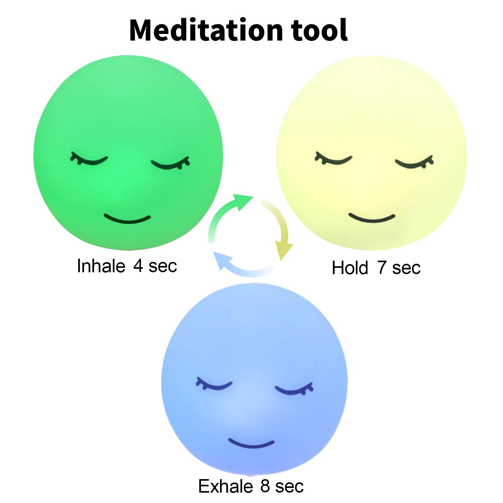The Breathing Lamp Guided Visual Meditation Tool is designed to provide you with a unique way to practice mindful breathing and calm your mind. With its 3 color breathing mode and silicone cute smiley face lamp. As we all know, stress and anxiety can have a negative impact on our mental and physical health. Consistent mindfulness practices, such as mindful breathing, can help reduce stress levels and promote overall well-being. This Guided Visual Meditation Tool serves as a valuable assistance for those who struggle with stress and anxiety in their daily lives. LED breathing light will slowly and gently pulse in and out, prompting you to follow and synchronize with the light by breathing deeply and calmly. This tool is perfect for busy individuals who want to take a break from their hectic schedules and unwind, as it can be used anytime and anywhere. Whether you're at home, work, or traveling, this tool can help you attain mindfulness and relaxation wherever and whenever you need it. The Breathing Lamp Guided Visual Meditation Tool is also a perfect gift for those who are keen on practicing mindfulness and meditation. It's a unique and thoughtful gift that promotes overall well-being and helps reduce stress and anxiety levels.