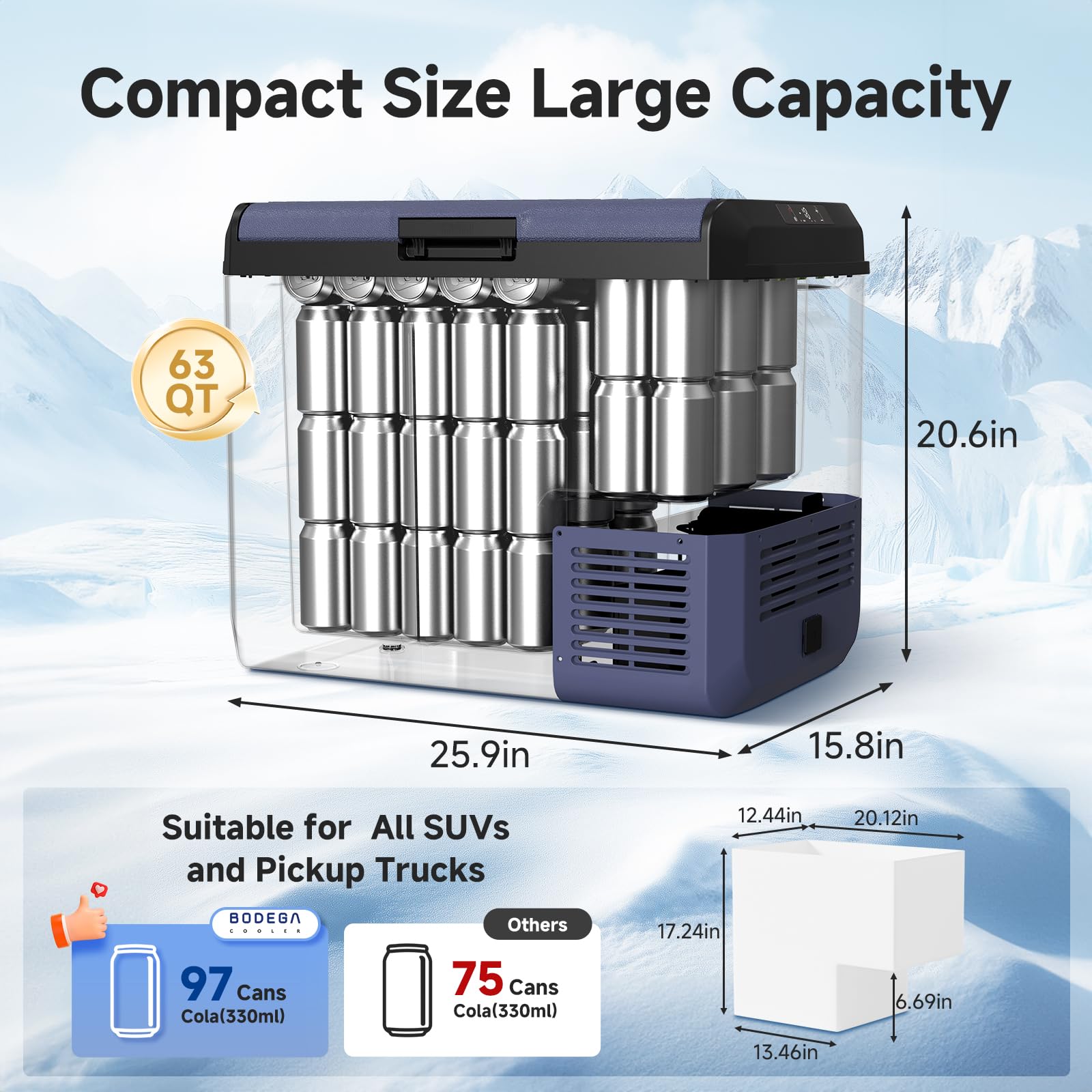 ใ๐๐ฎ๐ฟ๐ด๐ฒ ๐ฉ๐ผ๐น๐๐บ๐ฒ&๐๐ฃ๐ฃ ๐ฐ๐ผ๐ป๐๐ฟ๐ผ๐นใBODEGACOOLER 63 quart 12 volt car refrigerator has a large volume, can store all kinds of food according to your needs, no partition design is more convenient to store large food, large space to store your various foods,BODEGACOOLER car fridge with APP control, you can control the freezer from distance or in car.Intelligent temperature control function to meet the required temperature of various ingredients.