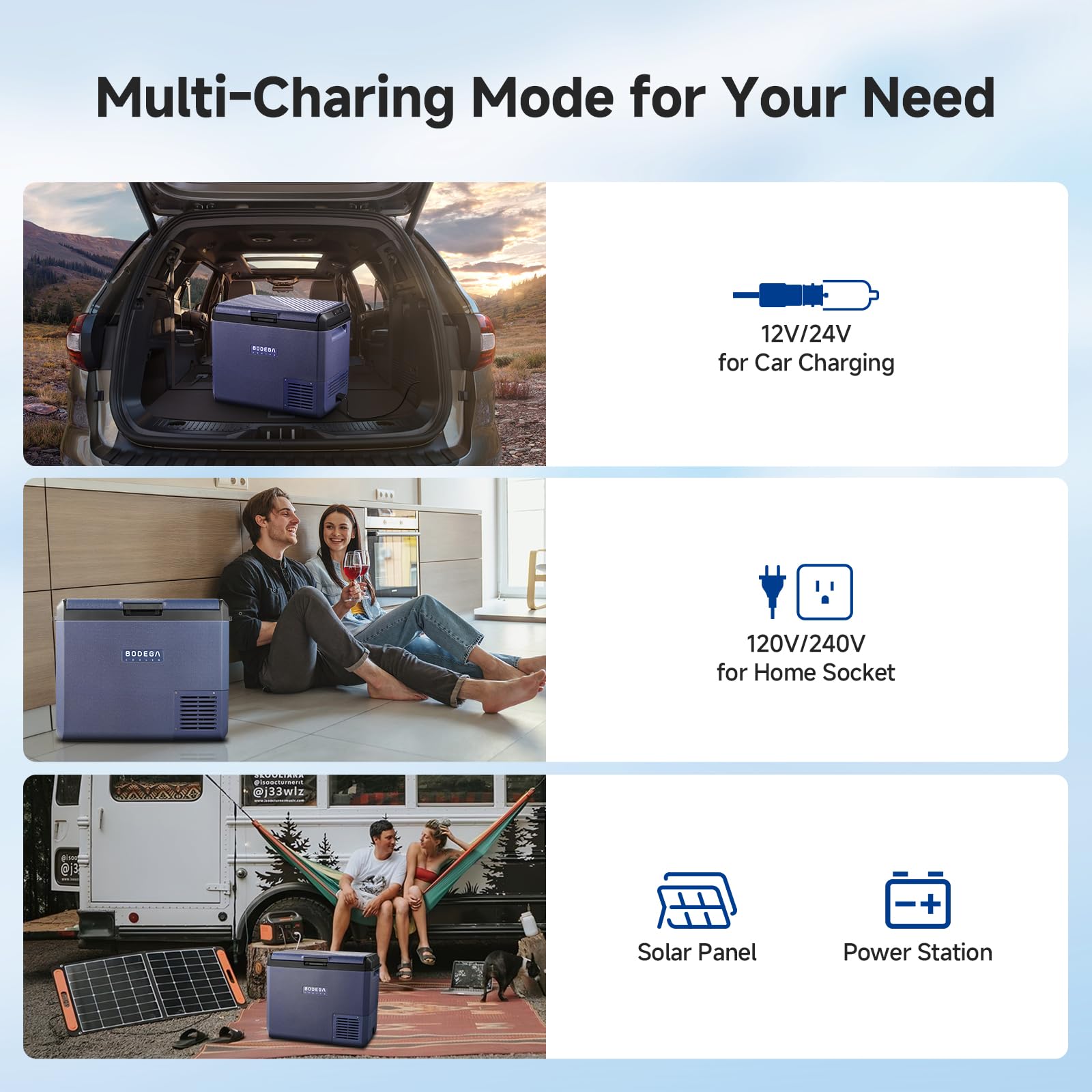 ใ๐๐ถ๐ ๐ง๐ฟ๐ถ๐ฝ๐น๐ฒ ๐ฃ๐ผ๐๐ฒ๐ฟ: ๐๐/๐๐/๐ฃ๐ผ๐ฟ๐๐ฎ๐ฏ๐น๐ฒ ๐๐ฎ๐๐๐ฒ๐ฟ๐ใ Versatile charging options! Compatible with 110V-220V outlets, 12/24V car sockets, and solar generators. BodegaCooler electric cooler works for camping, home, or emergencies.(Package included: 1*dc power cord, 1*ac power cord, 1*user manual)
