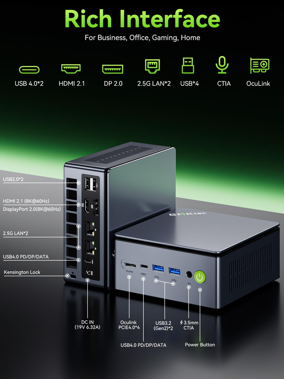 MINI PC COMPUTER SUPPORTS QUAD SCREEN 8K DISPLAY - Nucbox M7 Ultra gaming pc is equipped with Dual USB4 USB-C Video output. The latest HDMI 2.1 port can connect to large screen TV and Display Monitors and output up to 8K@60Hz resolution. The Type-C DisplayPort Video output can connect to the latest monitor displays utilizing 4K@144Hz. Features simultaneous four screen display