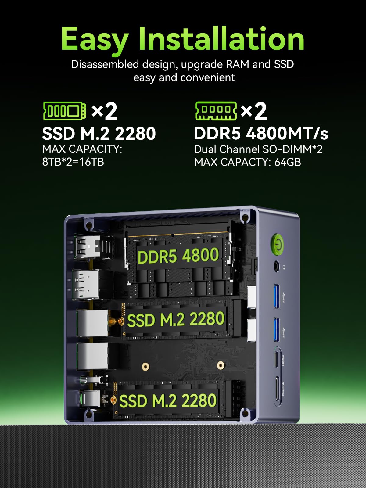 32GB DDR5 DUAL CHANNEL RAM & 512GB PCIE SSD DUAL SLOT EXPANSION - Installed with DDR5 32GB RAM 4800MHz (Dual Channel 2x16B), the Nucbox M7 Ultra mini pc support expansion to 128GB RAM. Featured with 512GB M.2 2280 PCIe 3.0 SSD, supports dual slot expansion to 2*PCIe 4.0 2TB SSD up to 4TB. (Upgrades not included)