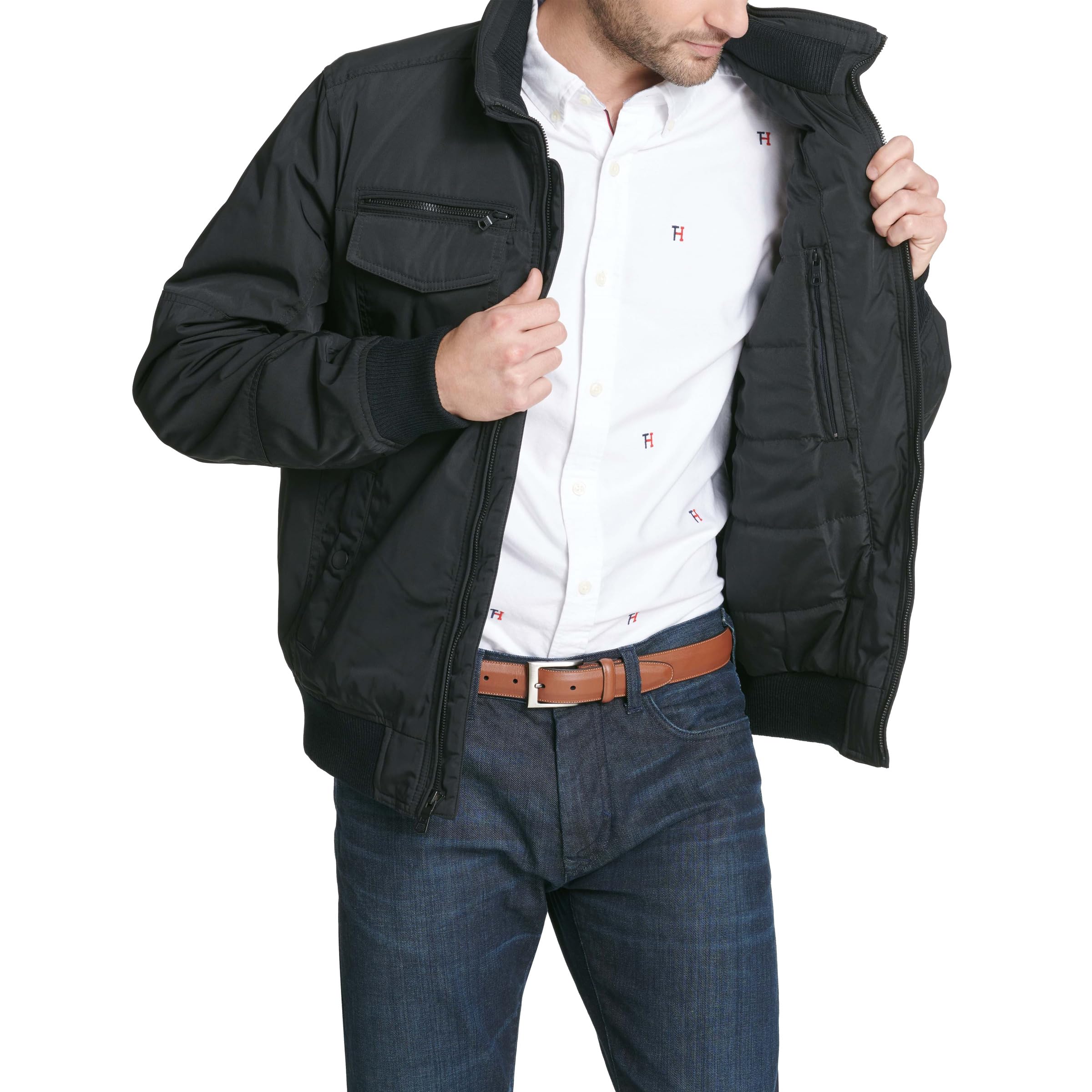 Description Poly twill four pocket performance mid-weight rib knit zip front bomber jacket with utility collar and hidden hood. Contrast quilted lining with light poly fill insulation.