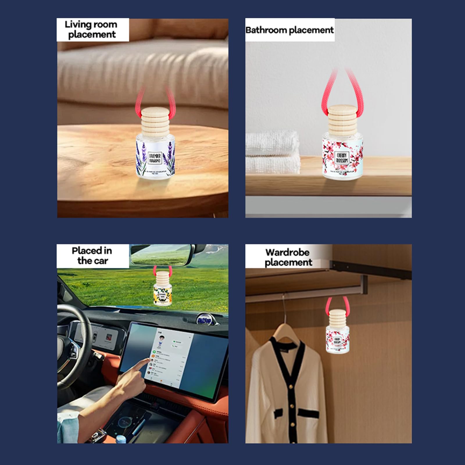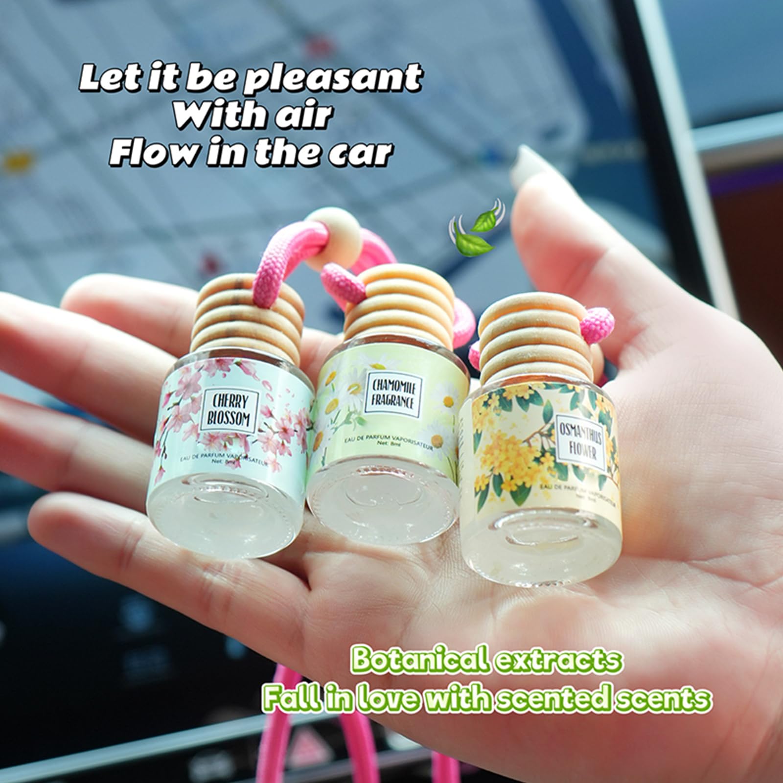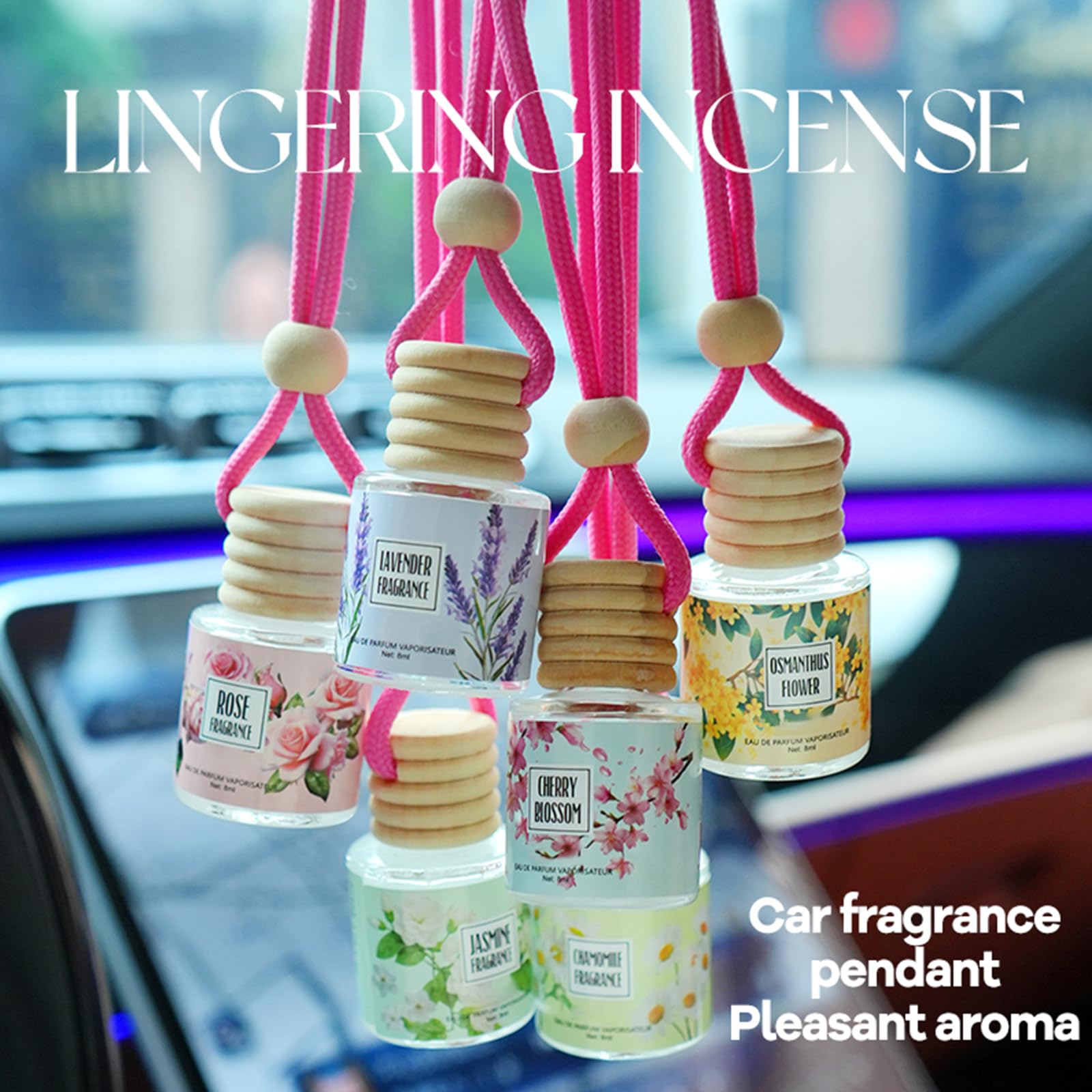 AIR FRESHENER BLENDED BY FRAGRANCE BLENDER: Our car scents air freshener offers a wide range of scents, including lavender, rose, chamomile, jasmine, cherry blossom, osmanthus, pistachio & salted caramel, pink champagne, teakwood & mahogany, and vanilla cream. You can choose the car scents according to your preferences and mood.