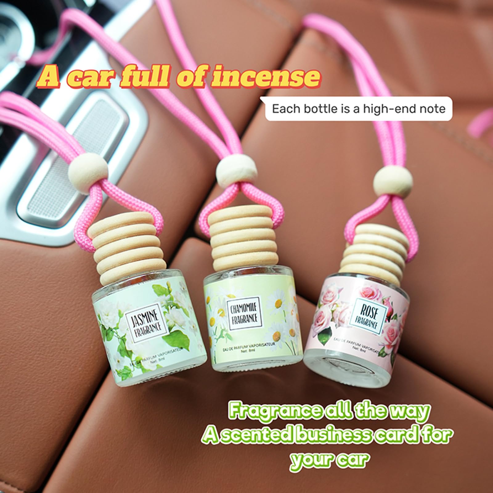 HIGH-QUALITY CAR AIR FRESHENER: Our car fresheners are made with high-quality raw materials and contain no alcohol. The car fragrance bottle is crafted from high-quality glass, which is shatter-resistant, and comes with a thick ribbon.