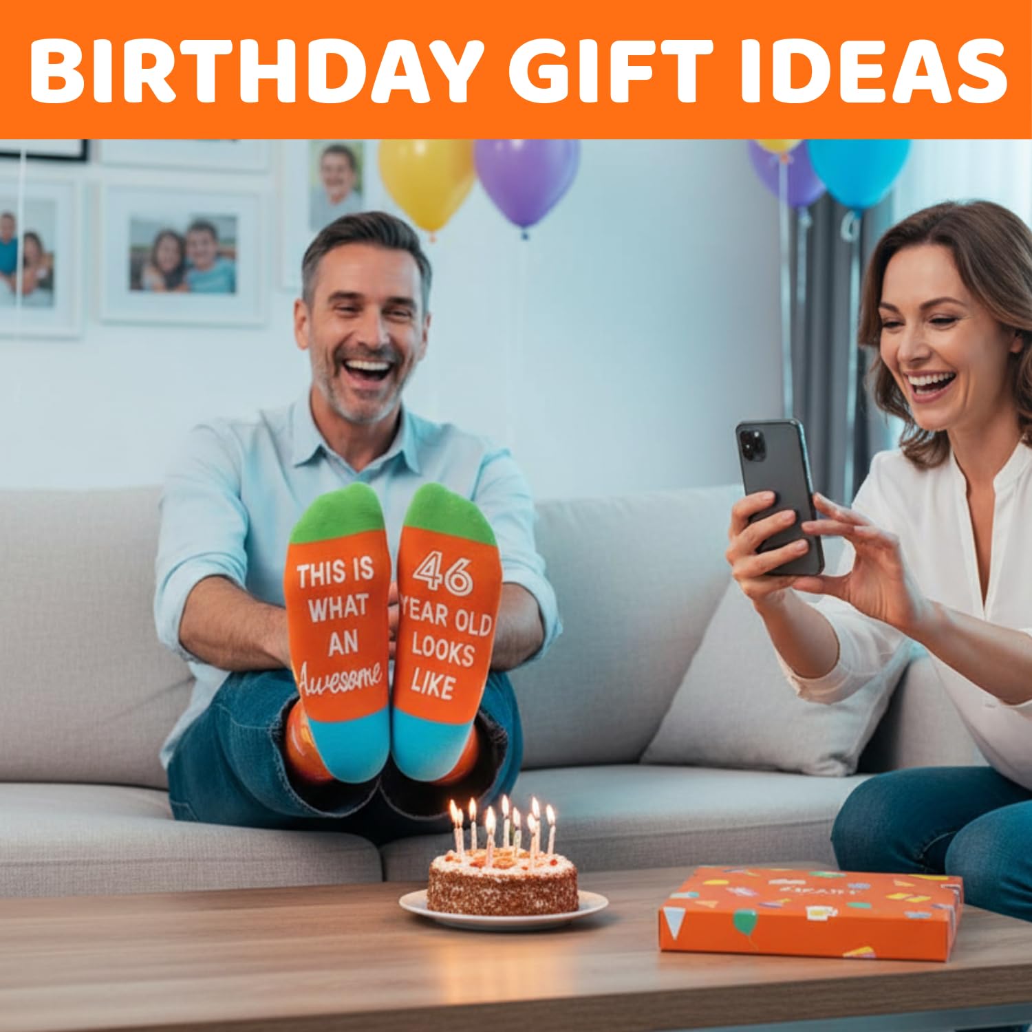 GIFTS FOR 46 YEAR OLDS: The top of the socks features birthday gifts, hats, cakes, and other elements, the bottom features a hilarious secret message written in non-slip ink: "THIS IS WHAT AN Awesome 46 YEAR OLD LOOKS LIKE."