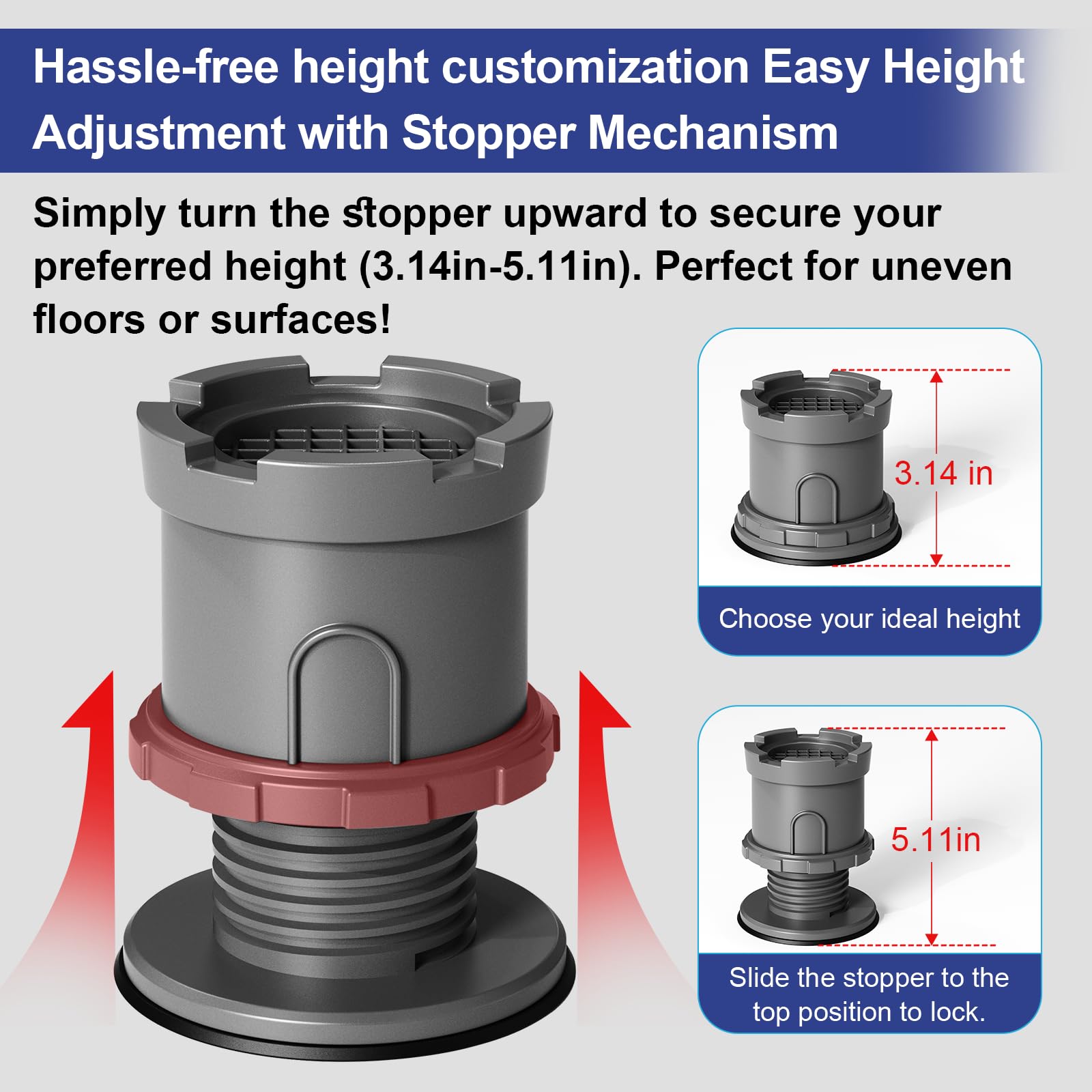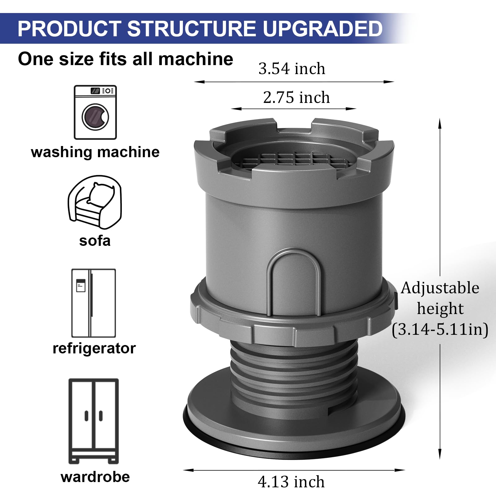Adjustable Height: CUISIBOT anti vibration pads for washing machine with height adjustable design lifts the washing machine about 3.14-5.11 inches, allowing you to customize the height you want. Absorbs vibration, noise and stops shaking at the same time. Solves the problem of difficult draining and cleaning.