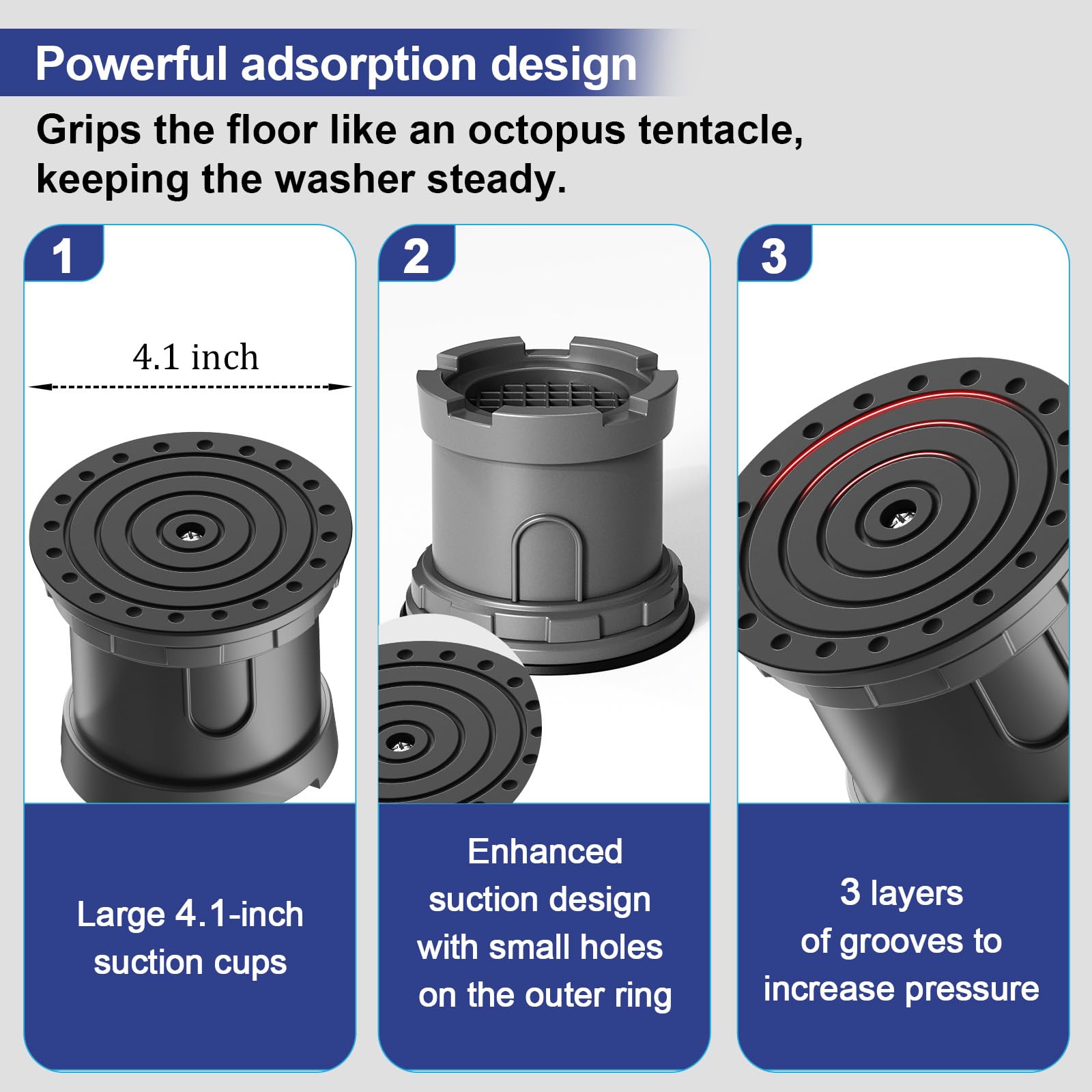 High Quality: The washer and dryer pedestals is made of high quality PP and TPU, the washer feet have a large 4.1 inch suction cup bottom that prevents vibrating washers from walking, slipping and moving and reduces noisy vibrations from dryers and other rotating machines. It not only protects the machine, but also protects the floor.