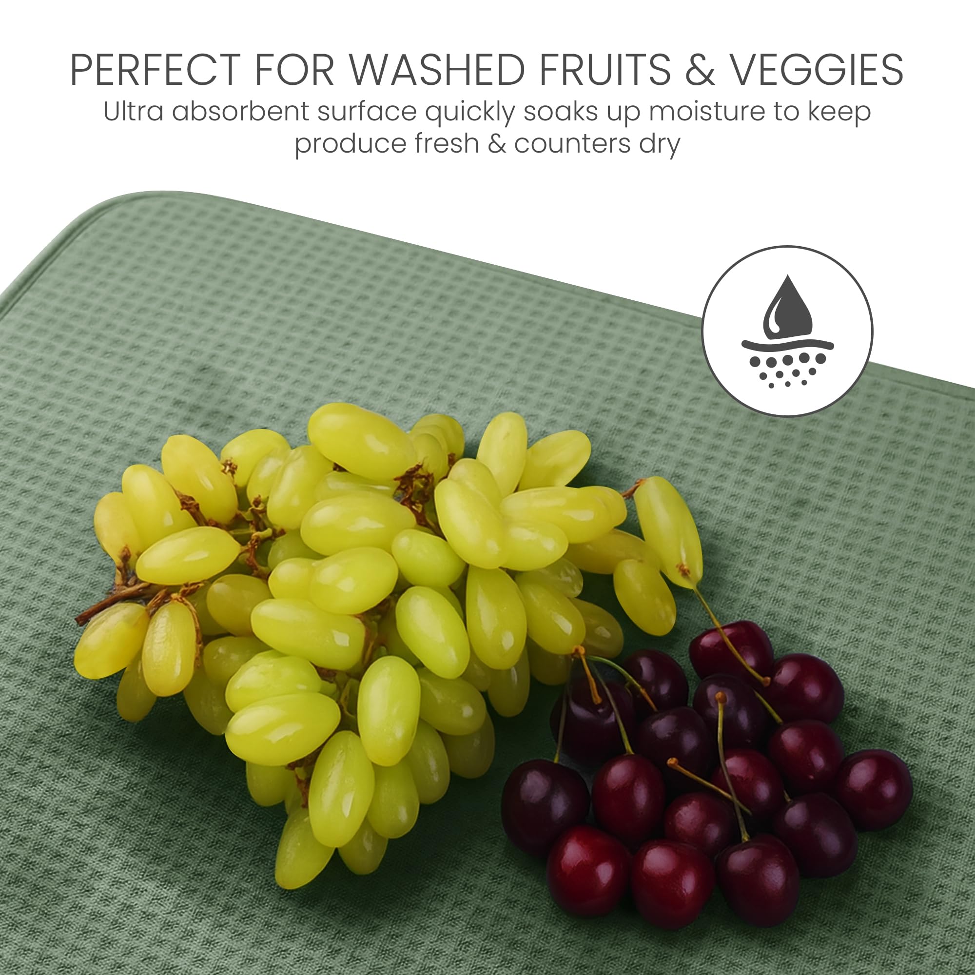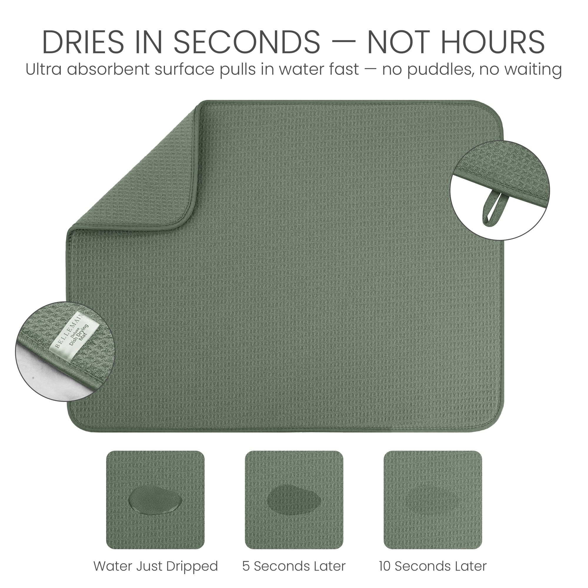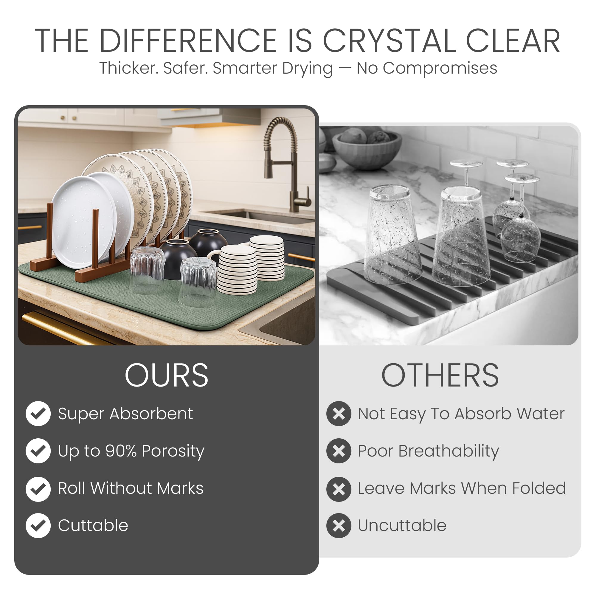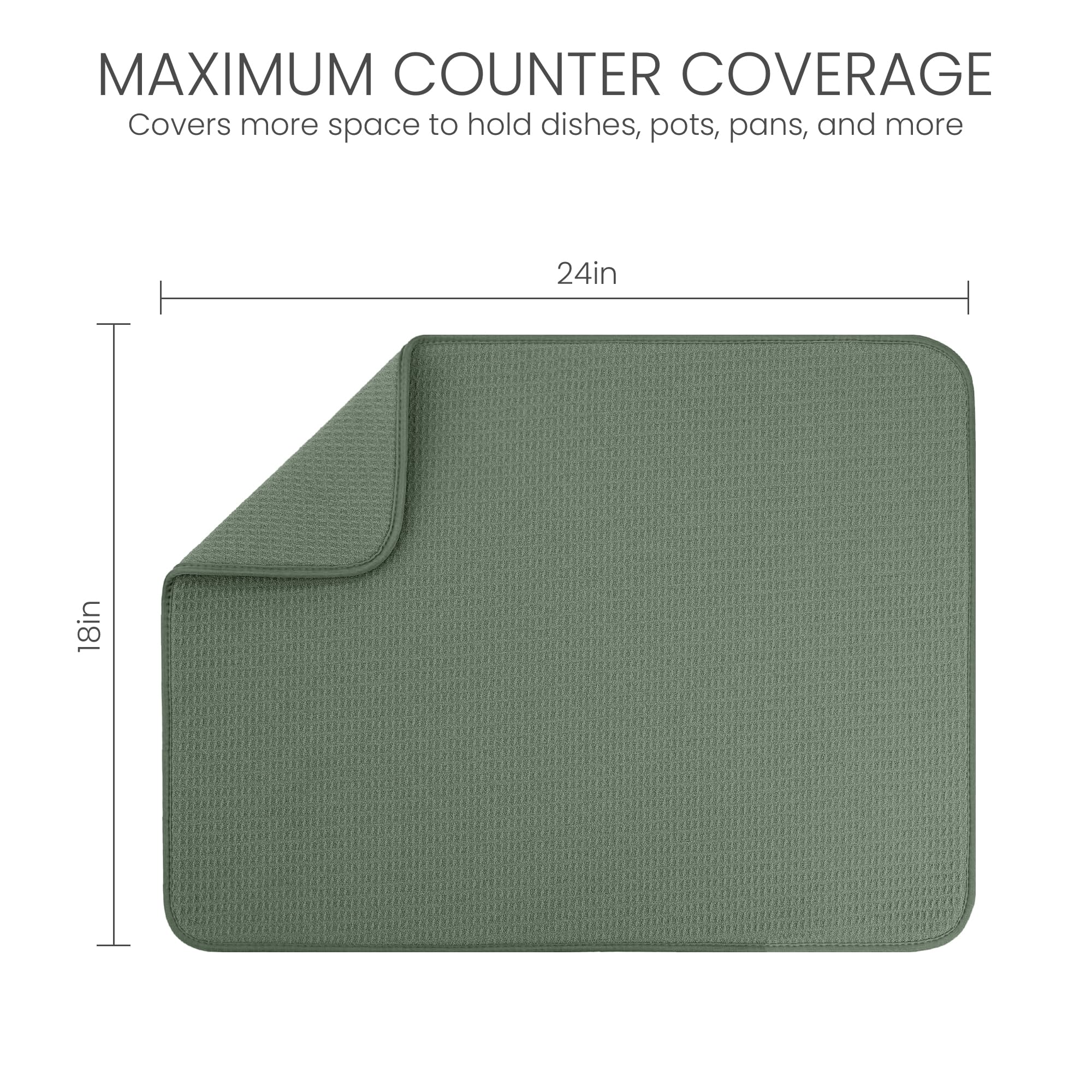 THICKEST , STYLISH MAT | INNOVATIVE HONEYCOMB WEAVE: Keep your counter spotless even while washing a sink full of kitchen dishes . Our superbly stylish drying mat is among the thickest on the market today , and its innovative honeycomb microfiber structure enhances absorption and quickens drying time . Idea kitchen accessories for countertop