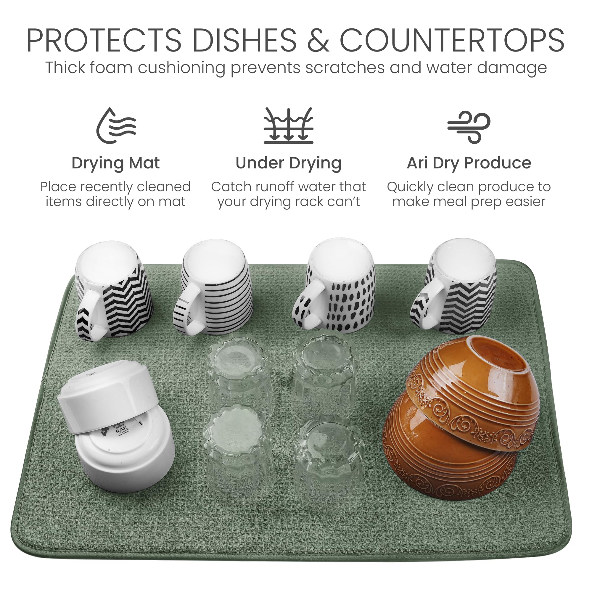 KEEP YOUR ANTIQUE GLASSWARE SAFE: Our stylish kitchen drying mat protects your counter from scuffs and scratches while also keeping your most prized kitchen essentials and glassware safe and sound . And If you ever feel like washing your dish drying mat , simply toss it in the wash with the rest of your laundry-this absorbent microfiber construction has a flexible core that does not weaken in the wash