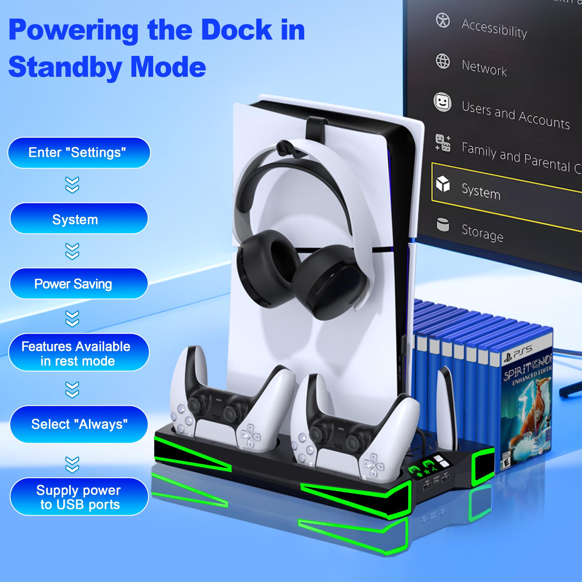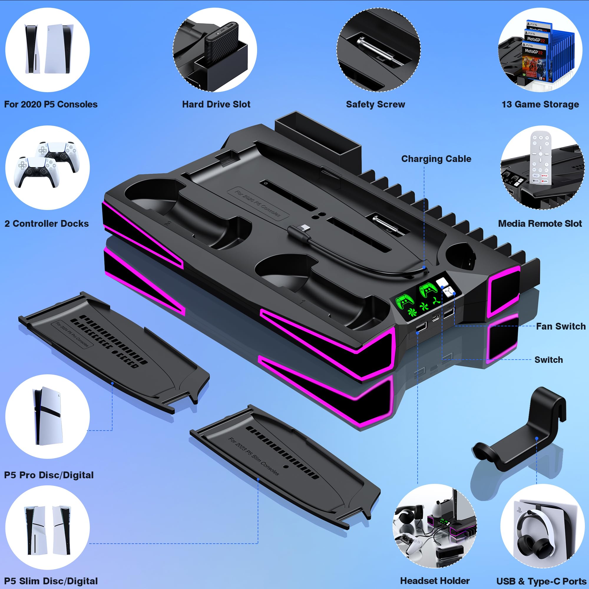 Organize Your Gaming Gear: Keep your gaming space as epic as your gameplay! Our ps5 cooling&charging dock holds up to 13 game discs, your headset, and the PS5 media remote, all while adding stylish lighting and three extra charging ports for your devices. Say hello to a tidy and organized setup!
