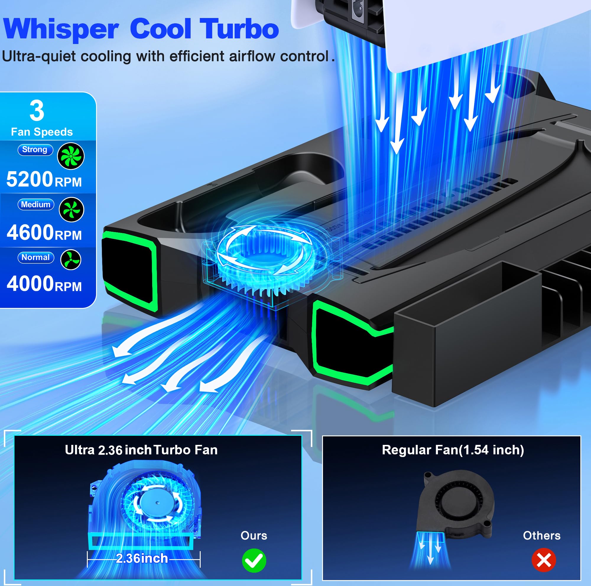 Tubocharged Cooling Power: Say goodbye to overheating! Our upgraded 100W turbo cooling fan for ps5 cranks up the cooling power by 3x, with three adjustable speeds to keep things chill during your most intense gaming marathons. Plus, ps5 cooling station remembers your favorite fan speed!—just like your trusty sidekick