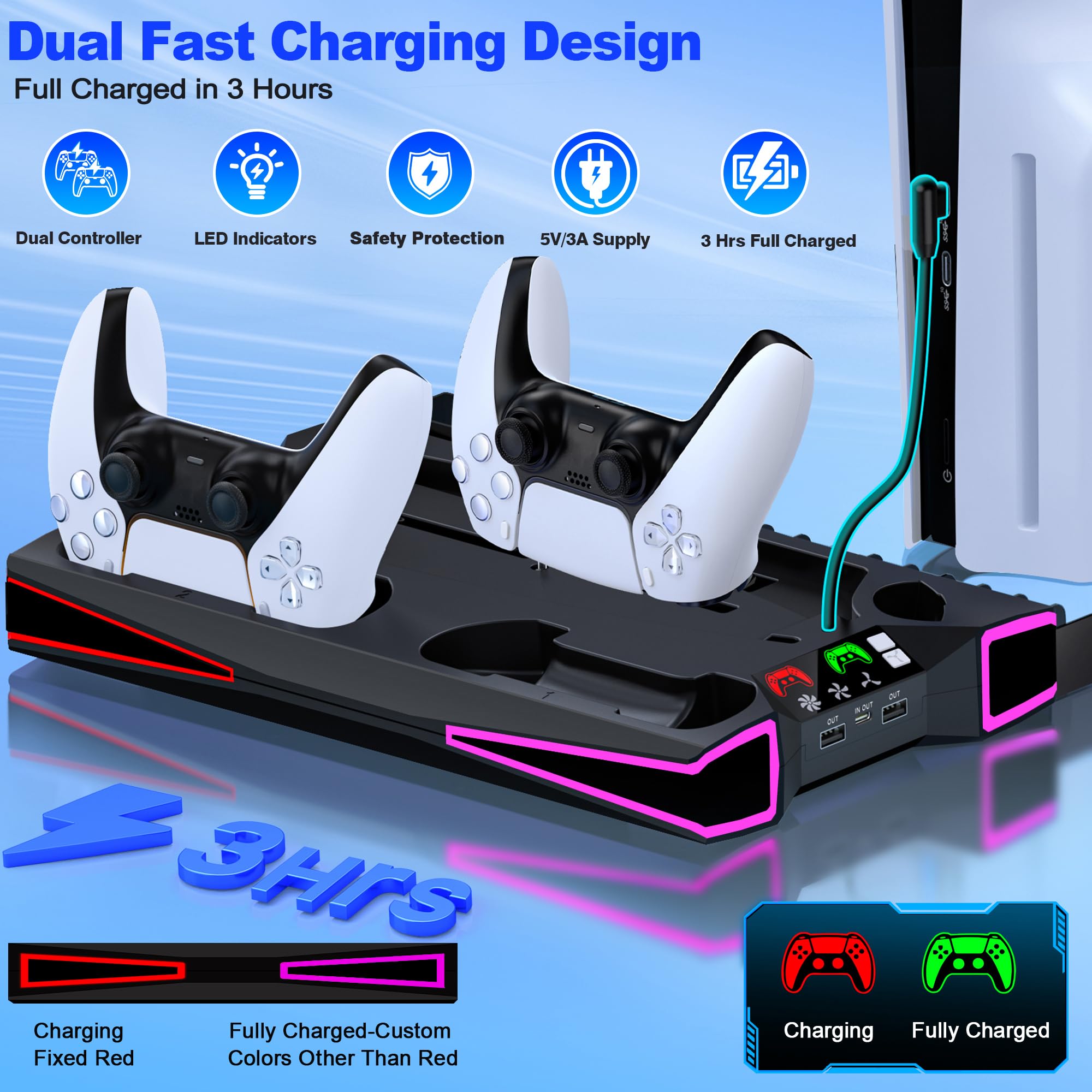 Lightning-Fast Charging the Controller: Get ready to game without downtime by this ps5 charging station! Charge dual controllers in just 3 hours, complete with vibrant LED indicators. No more guessing—red means charging, and colorful lights mean fully charged and ready for action!