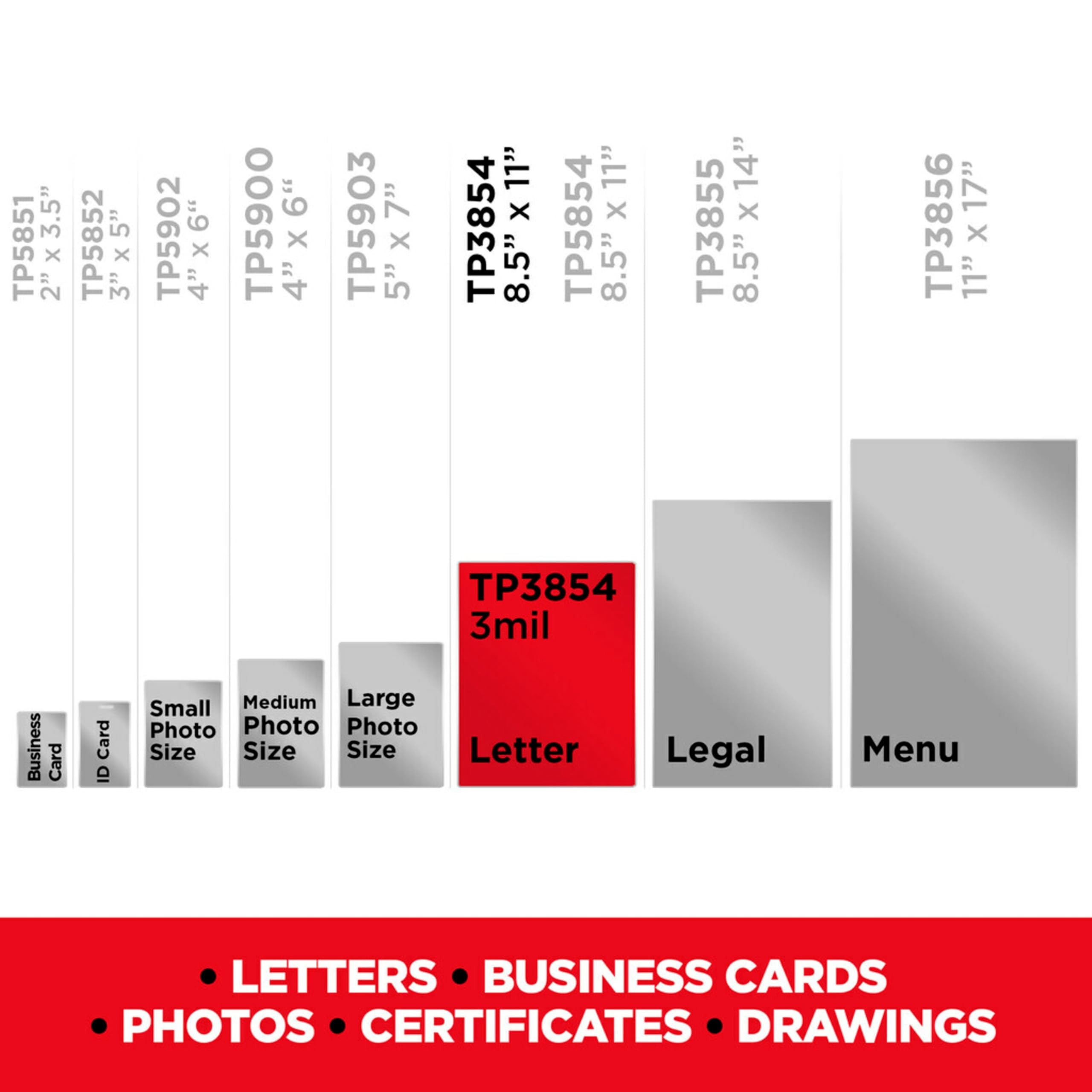 Scotch Thermal Laminating Pouches are ultra-clear pouches that protect and add professionalism to documents you use frequently. These laminating pouches allow important information to show through with a clear, photo-safe finish. Lamination pouches are ideal for creating marker-proof, tear-proof and spill-proof paper items that you want to last in the home, office or classroom. These self laminating pouches are great school supplies and office supplies. Use laminate pouches for laminating signs, flyers, schedules, certificates, to-do lists, children’s artwork and other frequently used documents. Most household cleaners are safe to use on these laminator pouches, so you can disinfect them and know your important documents are germ-free (1). One package contains letter-size pouches that fit items up to 8.9 in. x 11.4 in. Each pack contains 100 pouches. For the best results, use these laminating pouches with Scotch Thermal Laminators. (1) Do not sanitize pouches before the lamination. Test a small amount in a corner before use, especially on important documents. Do not use acetone.