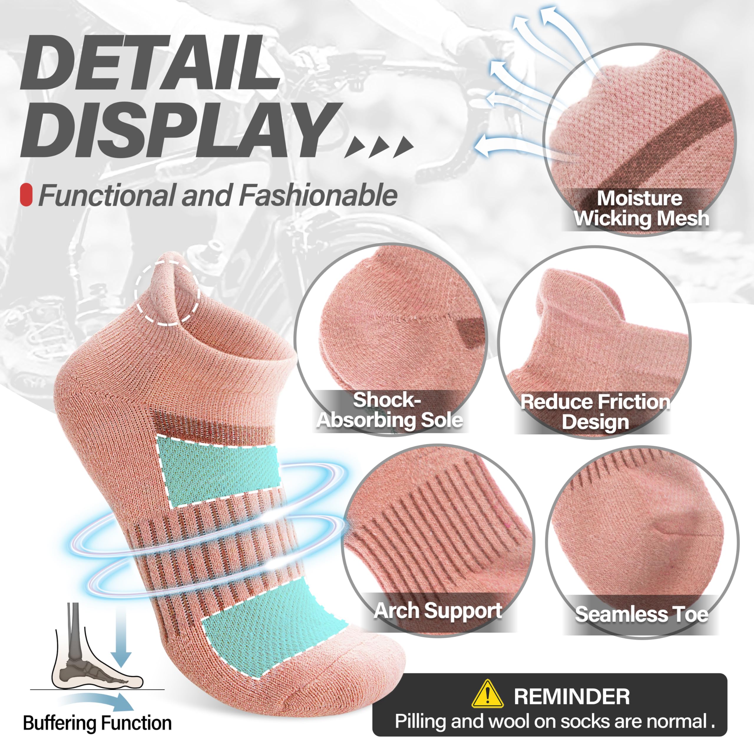 PROTECTION FOR FEET - These womens wool running ankle socks have stretchy cuff and arch support, which can have great compression support to reduce fatigue, protect the Achilles tendon, improve the blood circulation, and keep socks fit snugly. Cushioned sole absorbs shock and reduces risk of blistering. Pull tab resist abrasion and prevent slipping. All of these provide more protection for your feet.