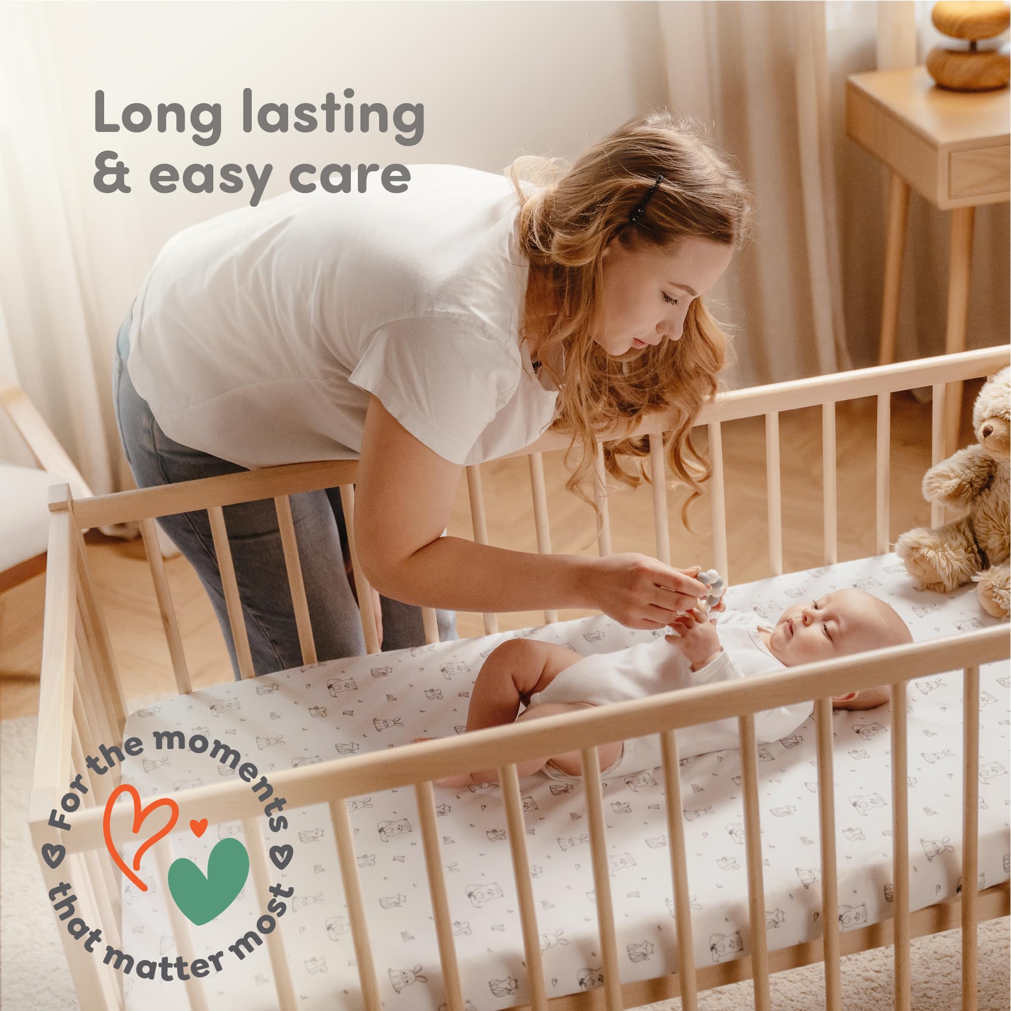 Durable and Long-Lasting: These crib sheets are made to withstand multiple washes while retaining their softness and shape. Machine washable and dryer friendly, they are a practical addition to any nursery, ensuring long-lasting use for modern parents.