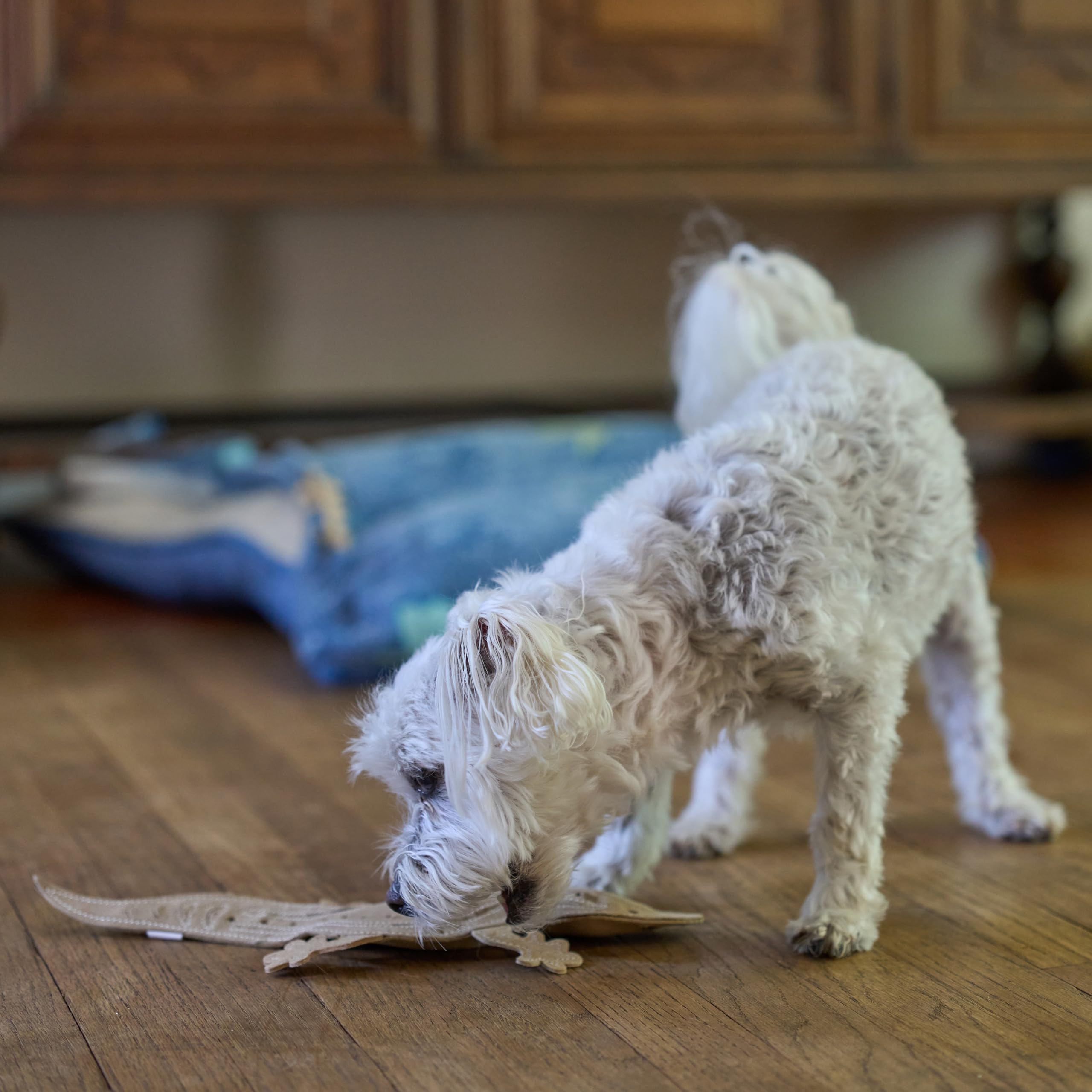 SPOT Skinneeez Leather Lizard stuffless dog toy with squeakers satisfies a dog’s natural hunting instinct. The realistic lizard design with natural leather scent provides fun dogs can't resist. Made without stuffing, this dog toy is made to last as your dog will be less inclined to destroy the furry tugging toy and chew through the inside, resulting in no mess or stuffing everywhere. Skinneeez Leather features three layers of fused leather for extra durability to withstand the aggressive play of your canine friend. In addition to the unique design this toy has to offer, two squeakers provide additional fun that will keep your fur friend coming back for more. The 15 inch long toy is great for medium to large dogs to tug, shake, carry, and chew on.