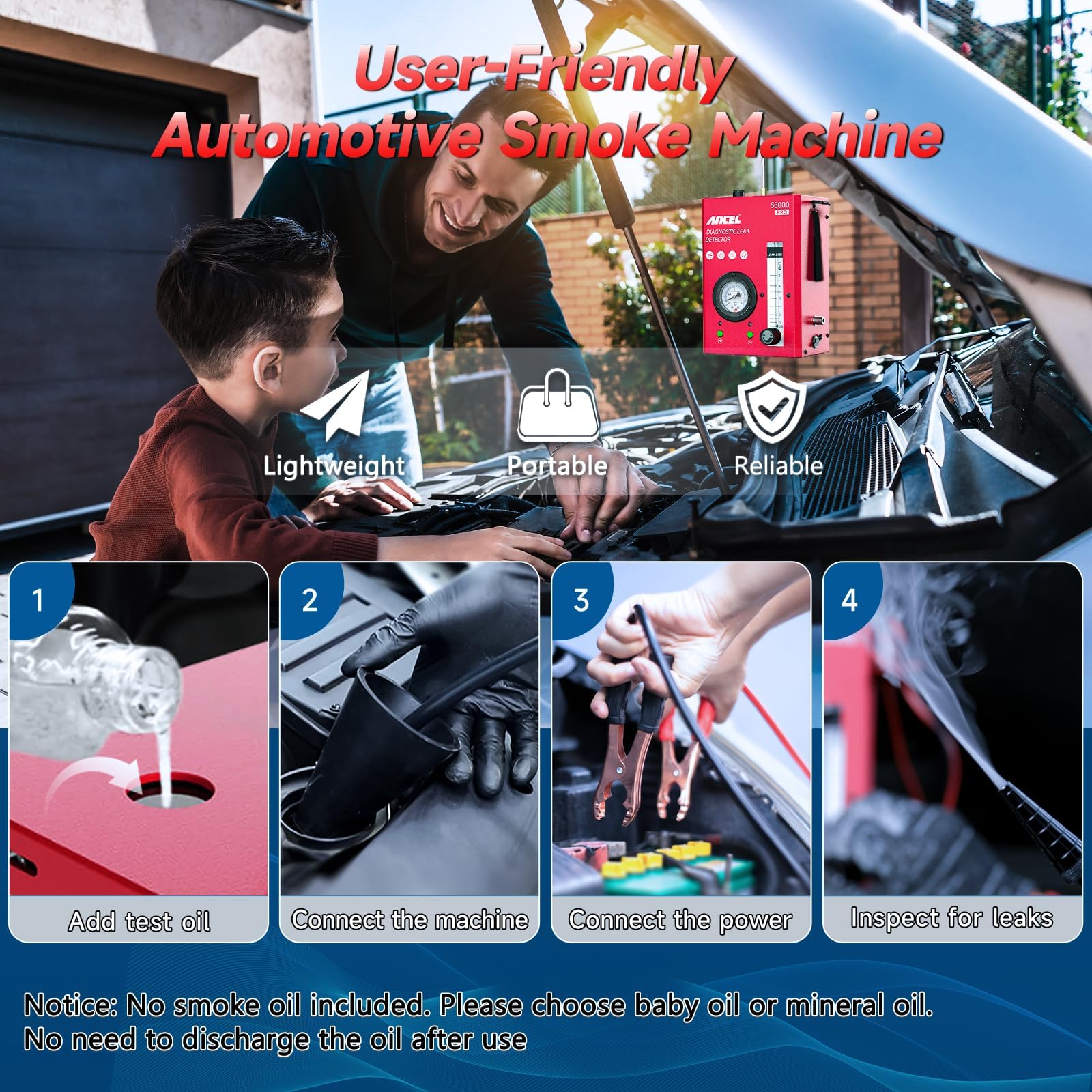 DETECT EVERY TYPE OF LEAK: Our versatile smoke machine for cars includes multiple vehicle cone adapters, a smoke delivery hose, intake bladder, and full-size automotive cap plugs. It seamlessly fits various lines and hoses, ideal for hassle-free checks on vacuum, fuel, engine, intake system and more